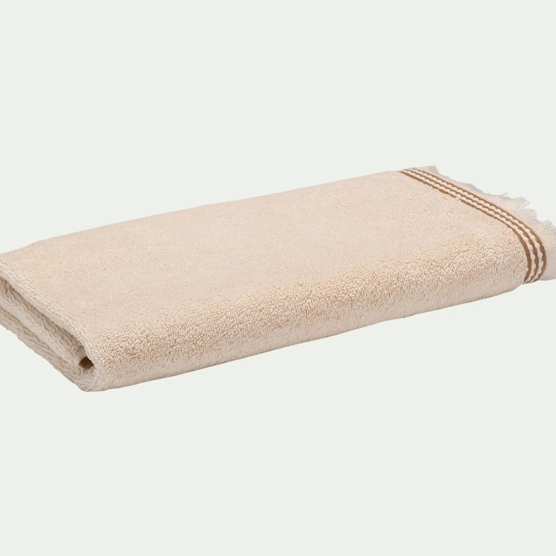 La serviette de toilette Amandine, en coton épais de 600g, enveloppe la peau d’une douceur réconfortante, tout en offrant un grand pouvoir absorbant. Son coloris blanc écru insuffle une note de douceur à la salle de bain, tandis que son liteau marron et ses fines franges ajoutent une touche d’élégance. Fabriquée au Portugal, cette grande serviette de toilette de 50×100 cm allie raffinement et qualité durable pour des instants de bien-être au quotidien.