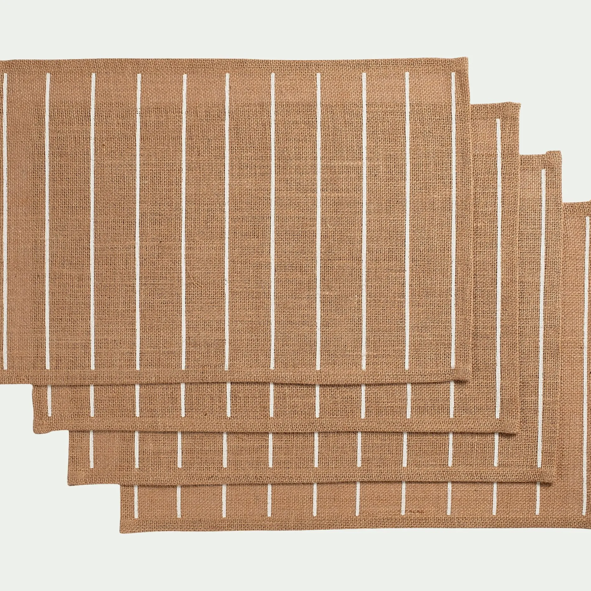 Les 4 sets Uzes trouvent leur place autour de votre table et participent à une atmosphère chaleureuse et authentique. Ces sets de table en jute mesurent 30×45 cm et présentent un motif minimaliste et intemporel : la rayure. Ce motif blanc se découpe sur la toile aux reflets dorés, une finition simple mais élégante qui apporte une touche décorative à toutes les occasions.