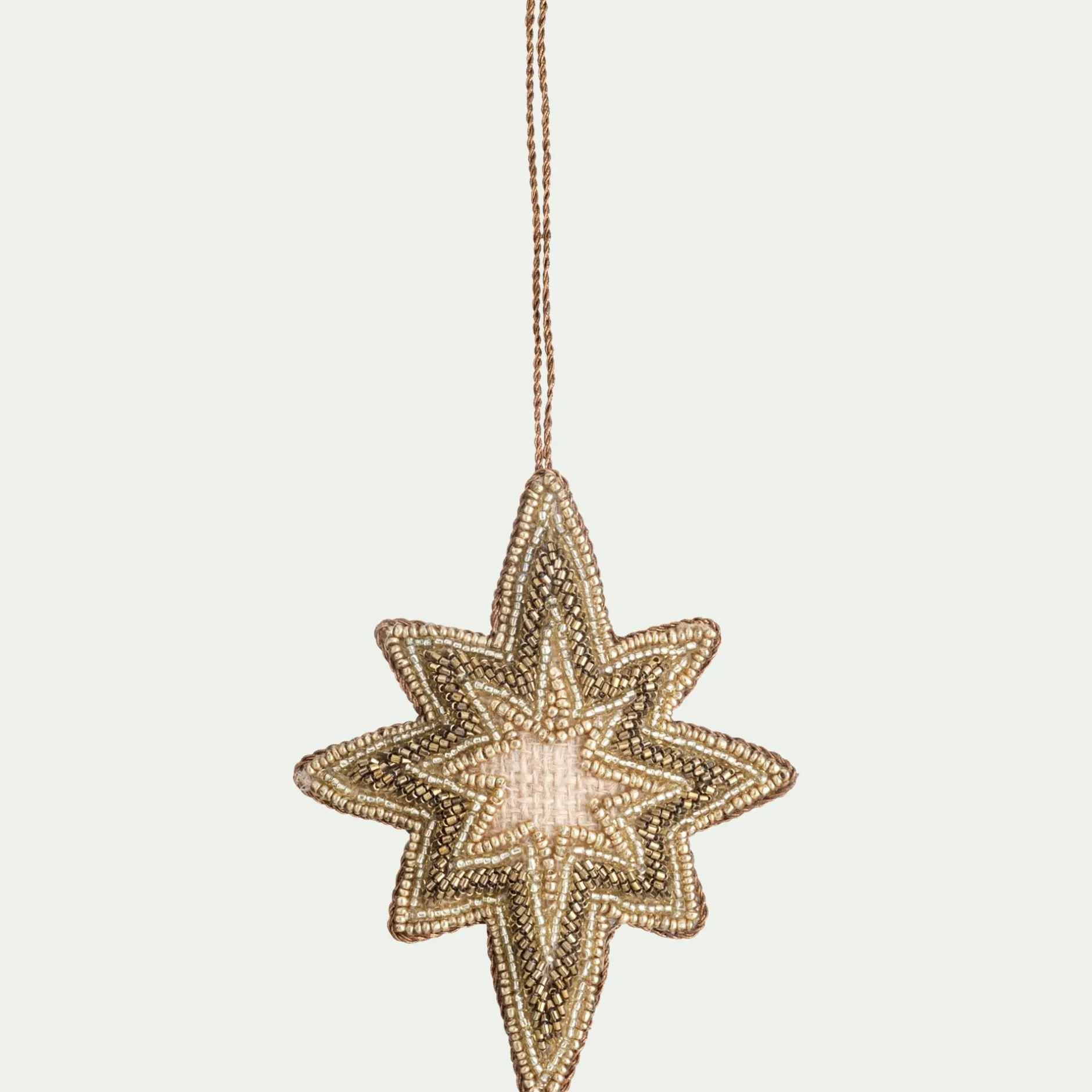 Apportez une touche d’originalité à votre sapin avec cette suspension de Noël en forme d’étoile. Conçue comme un patch en jute, elle se distingue par ses perles dorées cousues avec du zari, un fil de broderie indienne. Son allure authentique et festive fait d’elle un véritable bijou pour votre arbre de Noël. Cette étoile, à la fois simple et éclatante, capte la lumière et rehausse votre décoration de Noël avec son éclat.