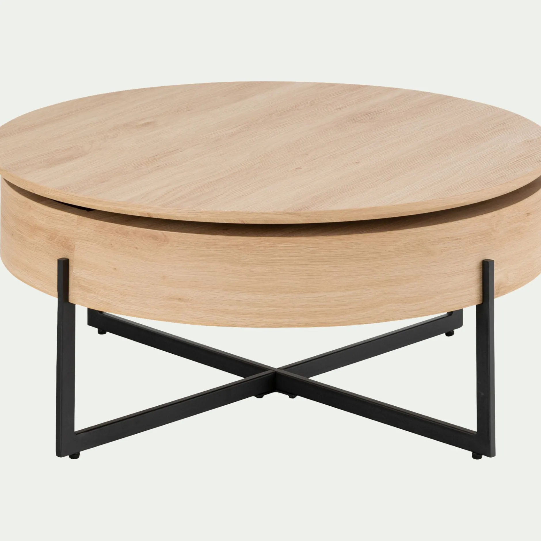 Optimisez votre salon avec la table basse Choucas. Cette table basse en bois comporte un caisson de rangement, dissimulé sous son plateau rotatif. Grâce à ce nouvel espace de rangement, votre séjour est mieux organisé. En bois clair, cette table basse ronde participe à une atmosphère naturelle et chaleureuse. Pratique et esthétique, c’est une pièce centrale du salon. Son piètement en métal noir croisé apporte du contraste à l’ensemble : la touche finale d’une meuble simple et au charme irrésistible.