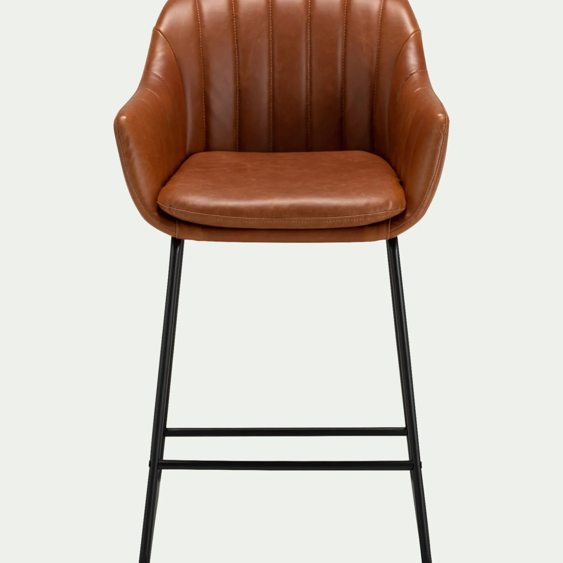 Une belle chaise haute en simili cuir marron au look vintage sur pieds métalliques noirs pour passer d’agréables moments à votre bar. Son coussin et son dossier muni d’accoudoirs vous procurent une excellente assise pour un confort optimal. Idéale pour passer du temps entre amis à refaire le monde autour d’un verre dans un intérieur tendance.