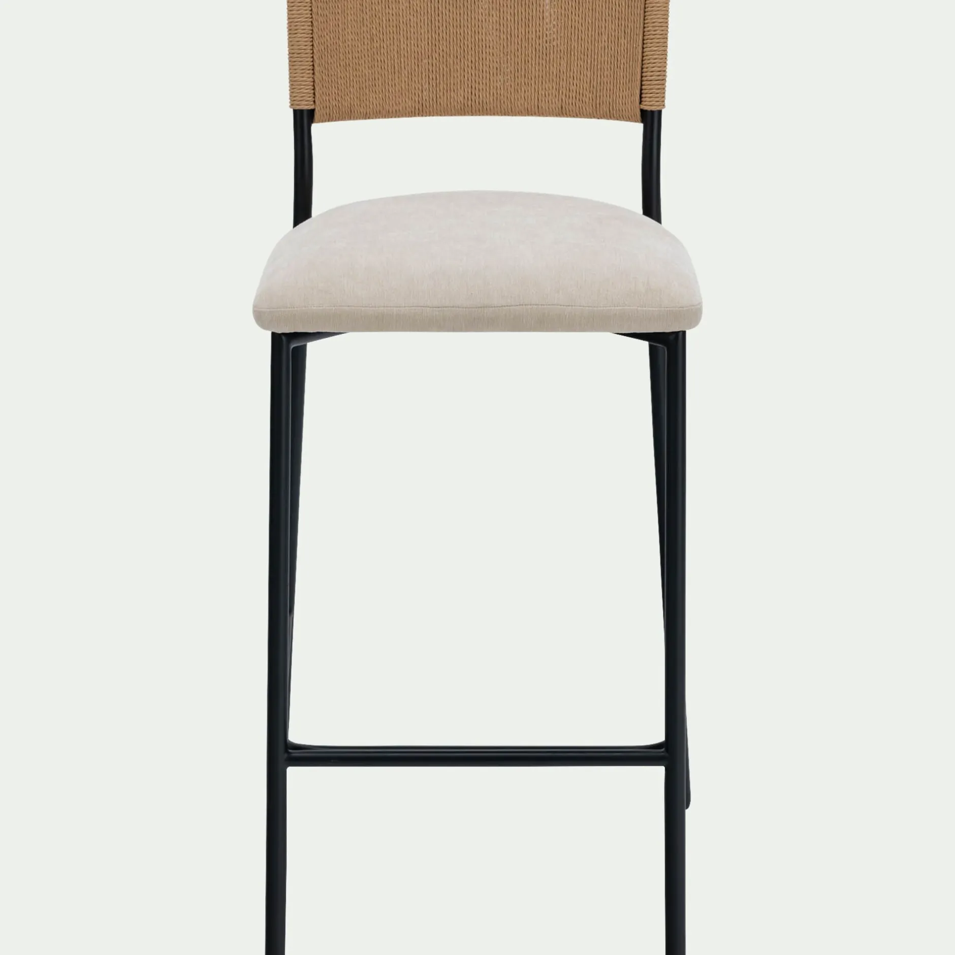 Le tabouret haut Dayne joue sur les contrastes avec audace et élégance. Son assise en tissu blanc écru, à la fois sobre et lumineuse, repose sur un piètement noir fin et moderne. Le dossier en corde tressée vient compléter l’ensemble avec une touche brute et graphique. Ce savant mélange de matières crée un tabouret design au caractère affirmé. Avec sa hauteur d’assise de 75 cm, il trouve parfaitement sa place autour d’un bar pour des instants conviviaux et gourmands.
