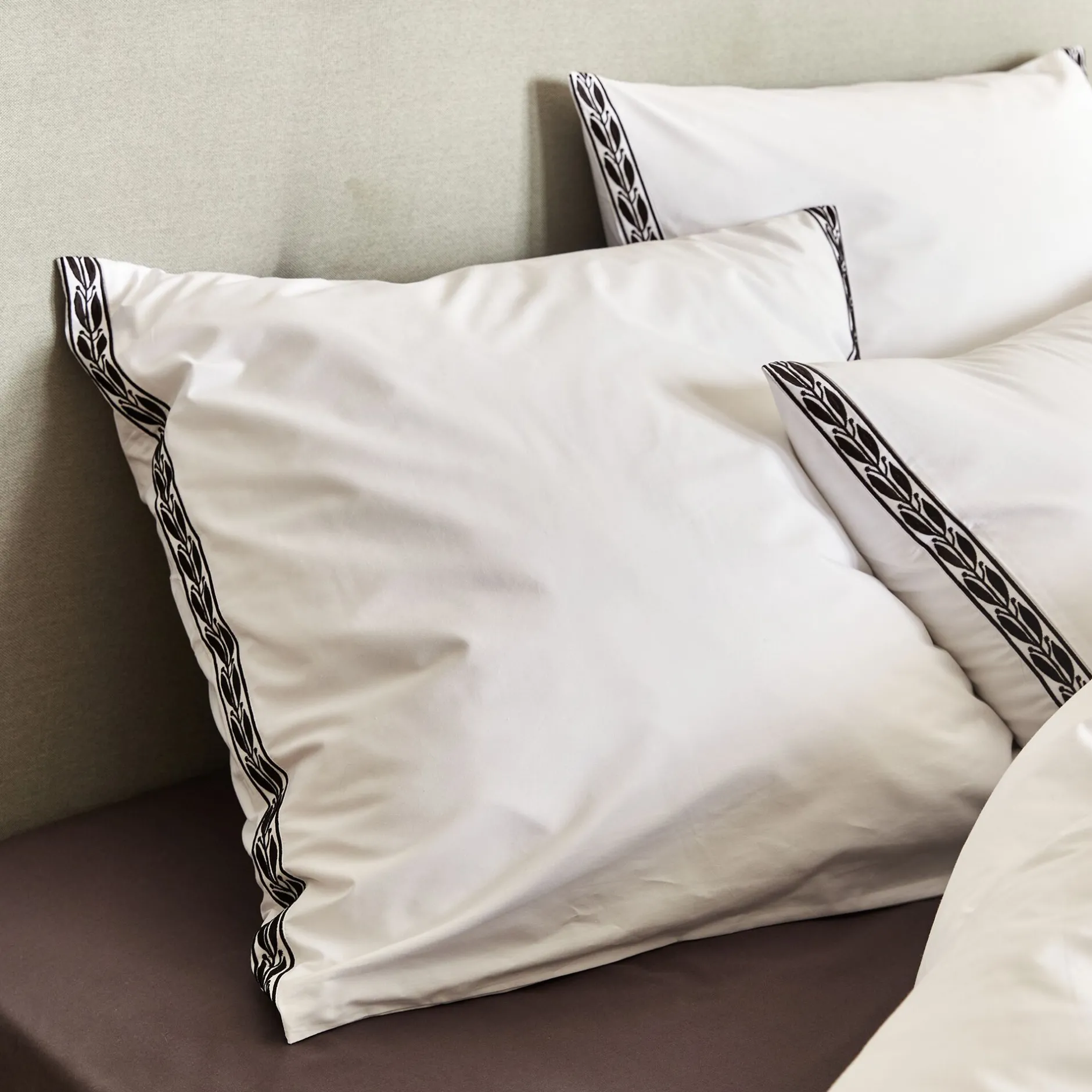 Apportez une touche d’éclat à votre lit avec les taies d’oreiller Kissos. Ces taies d’oreiller en percale de coton arborent un tissu uni, délicatement relevé par une frise noire. Brodé, ce liseré révèle un motif végétal aussi doux que poétique. Ces taies d’oreiller blanches conviennent pour des oreillers carrés de 65×65 cm. D’une belle simplicité, elles complètent n’importe quelle housse de couette avec élégance et cachet.