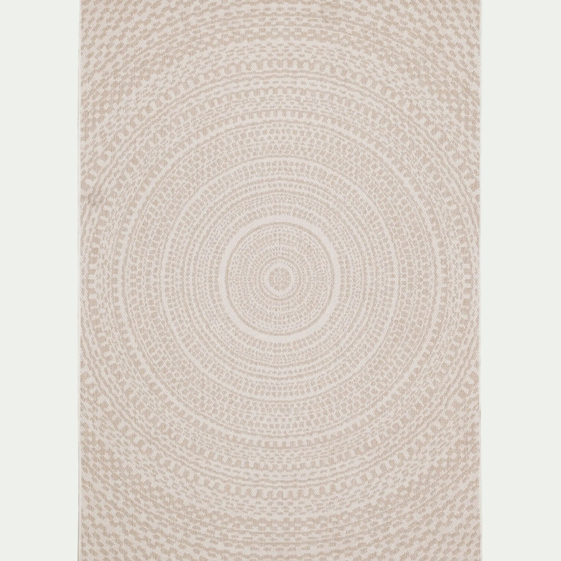 Un magnifique tapis en 120x170cm au décor spirale dans des tonalités naturelles. Avec son motif ensorcelant et son mélange de couleurs écrues, ce tapis au tissu tissé donne du volume à votre sol pour un effet de grandeur apprécié. Son tissu en plastique recyclé est très résistant ce qui vous permet de profiter de votre tapis durant de nombreuses années. Aussi bien adapté pour un usage intérieur que pour un usage extérieur, il décore aussi bien votre terrasse que votre salon. Ce grand tapis écru au style exotique revisité donnera, ainsi, beaucoup de caractère à votre maison ou à votre jardin.