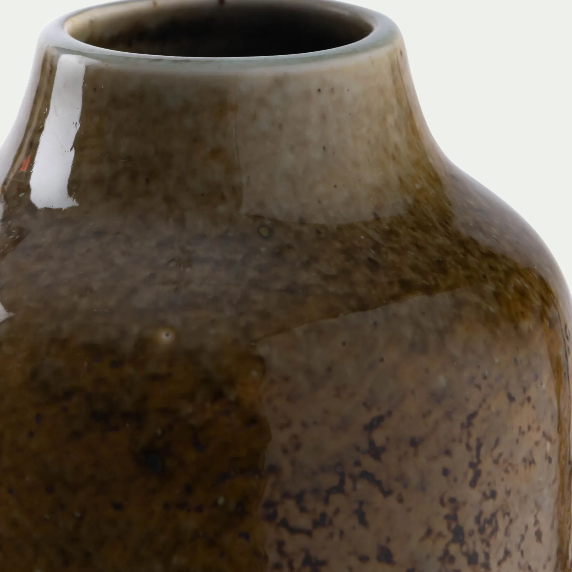 Petit objet plein de charme, ce vase décoratif joue les contrastes entre authenticité et raffinement. Confectionné en porcelaine, il présente une base brute couleur naturelle, surmontée d’un émail réactif marron aux reflets irréguliers. Chaque pièce devient ainsi unique, révélant des nuances subtiles qui réchauffent l’espace. À poser seul ou en accumulation, ce vase apporte une touche chaleureuse à la décoration.