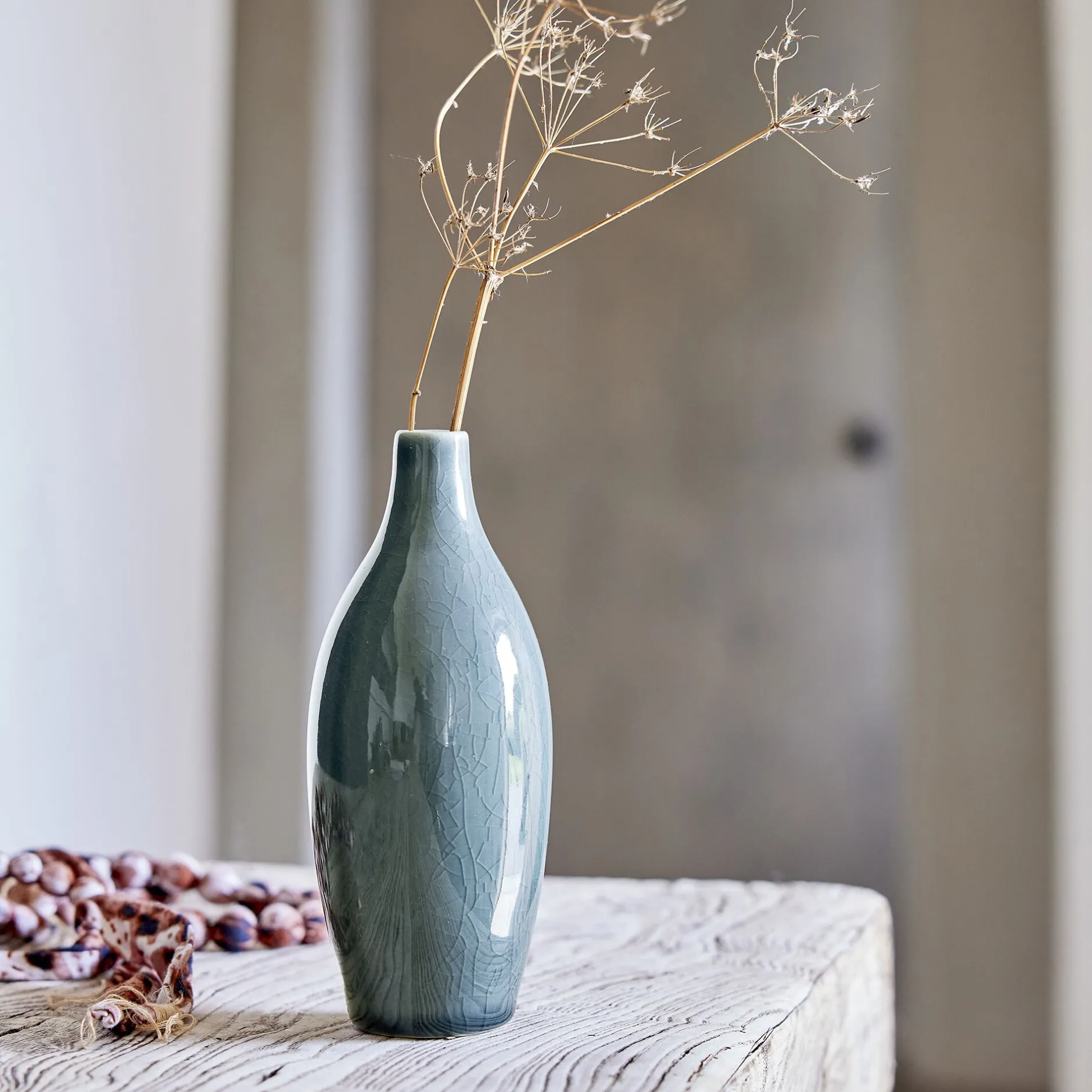 Ce vase en grès se distingue par sa finition émaillée et son effet craquelé, un détail qui lui confère une patine délicate et intemporelle. Sa couleur bleue, douce et apaisante, et sa forme élancée en font un objet de décoration raffiné, idéal pour une ambiance naturelle et élégante. Parfait pour accueillir une simple branche séchée ou une fleur, il peut également être utilisé avec un bouquet d’herbes de la pampa. Ce vase s’intègre harmonieusement dans un intérieur où les matières et les couleurs inspirent la sérénité.