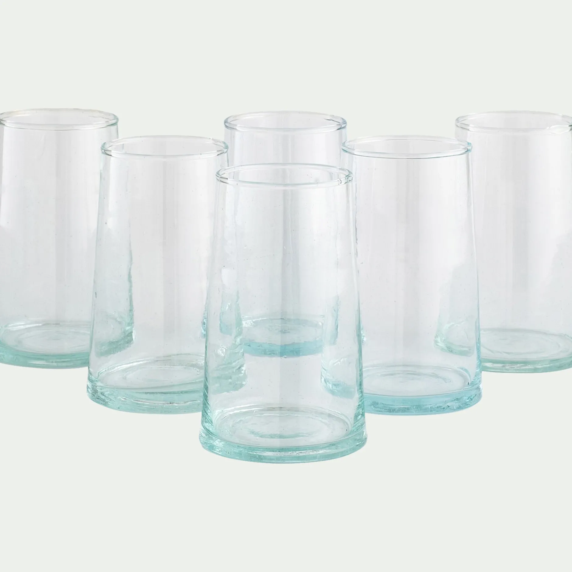 En verre recyclé, les verres Beldi sont soufflés à la bouche et coupés artisanalement à la flamme d’oxygène et de gaz. Les débris repartent à la fusion alors que les verres sont placés dans un four de recuite pendant 3h. Les verres Beldi enchantent par leur design épuré et délicat qui combine les plaisirs et raconte une histoire qui vous transporte sur les bords de la Méditerranée le temps d’un repas.