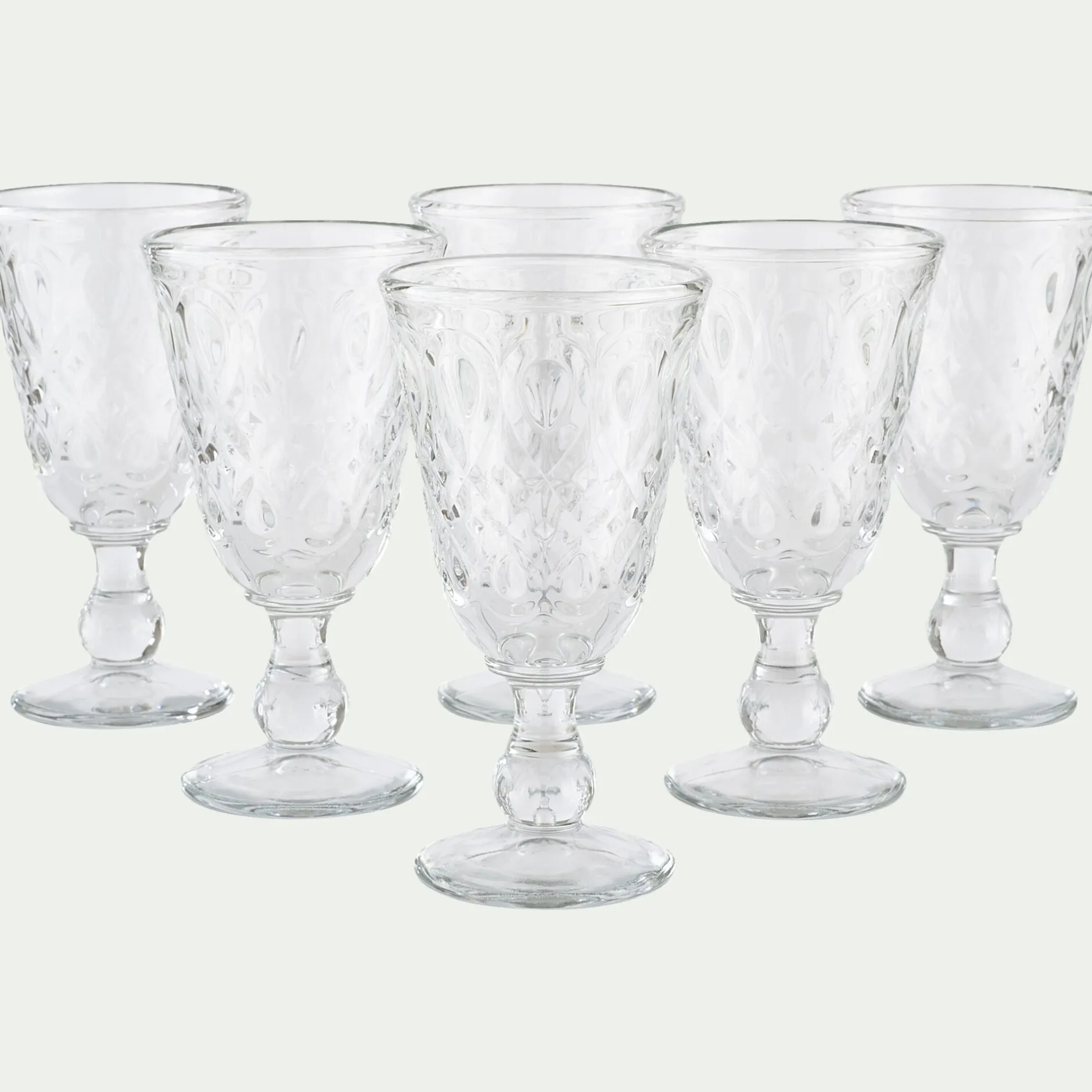 Ajoutez une touche d’élégance à votre table en optant pour ces verres à vin raffinés. Leur design brut et authentique, agrémenté d’un motif en relief, confère une esthétique unique à ces verres transparents. Ce lot de 6 verres de table ajoute subtilement une note chic à la déco de votre table. Avec une contenance de 23 cl, ces verres à pied en verre vous accompagnent tout au long du repas, ajoutant une dimension sophistiquée au dressage de votre table.