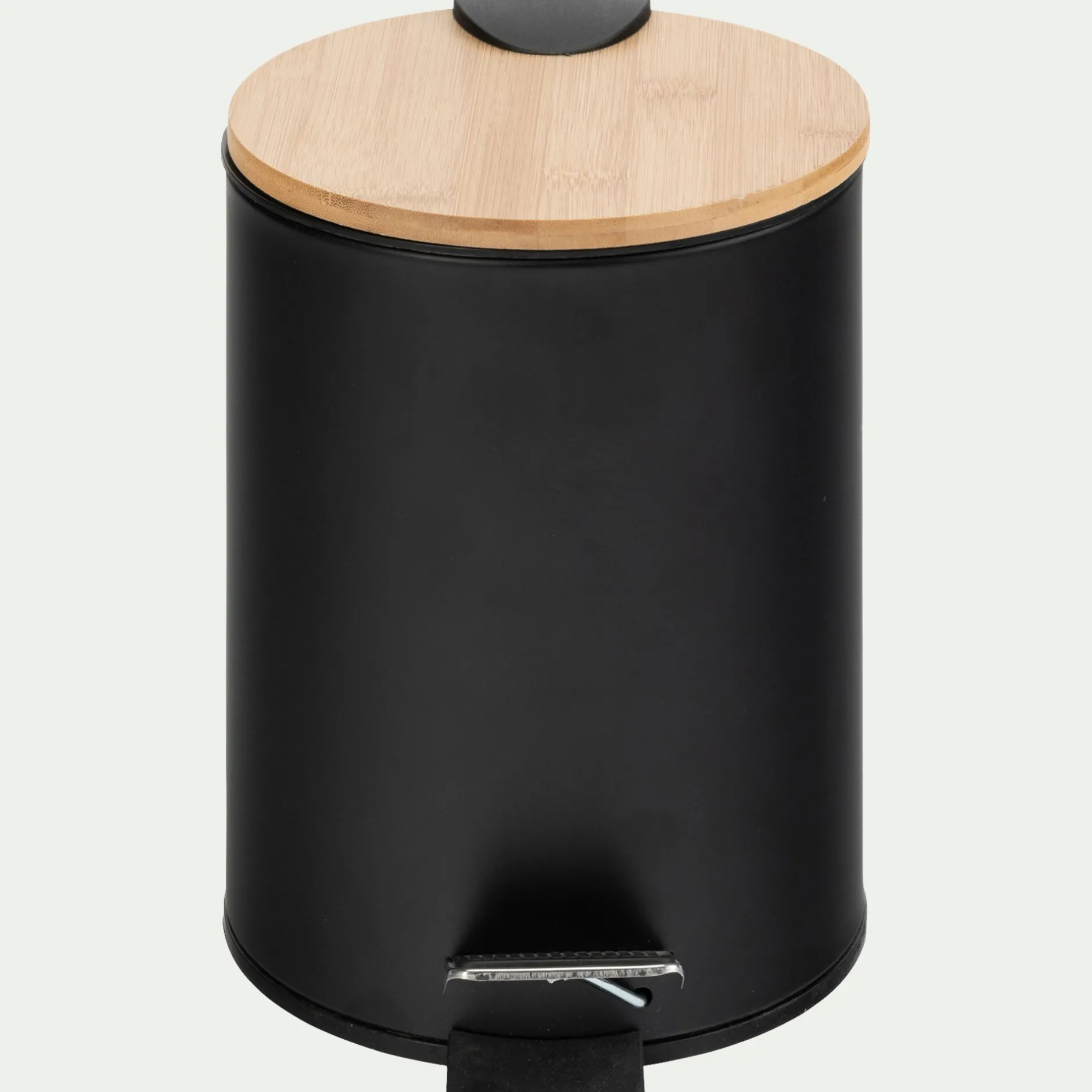 Travaillez les détails de votre décoration avec la petite poubelle Natys. Cette poubelle de 2,5 L est idéale dans une salle de bain. Avec sa petite contenance, elle se glisse parfaitement dans un coin de la pièce et sait se faire discrète. Cette poubelle noir mat est confectionnée en métal. Des détails en bambou viennent réchauffer son design et lui donner une touche naturelle. Cette poubelle de salle de bain fonctionne grâce à une pédale, actionnable au pied. Vos mains restent libres de tout contact : un système qui favorise l’ergonomie et l’hygiène.