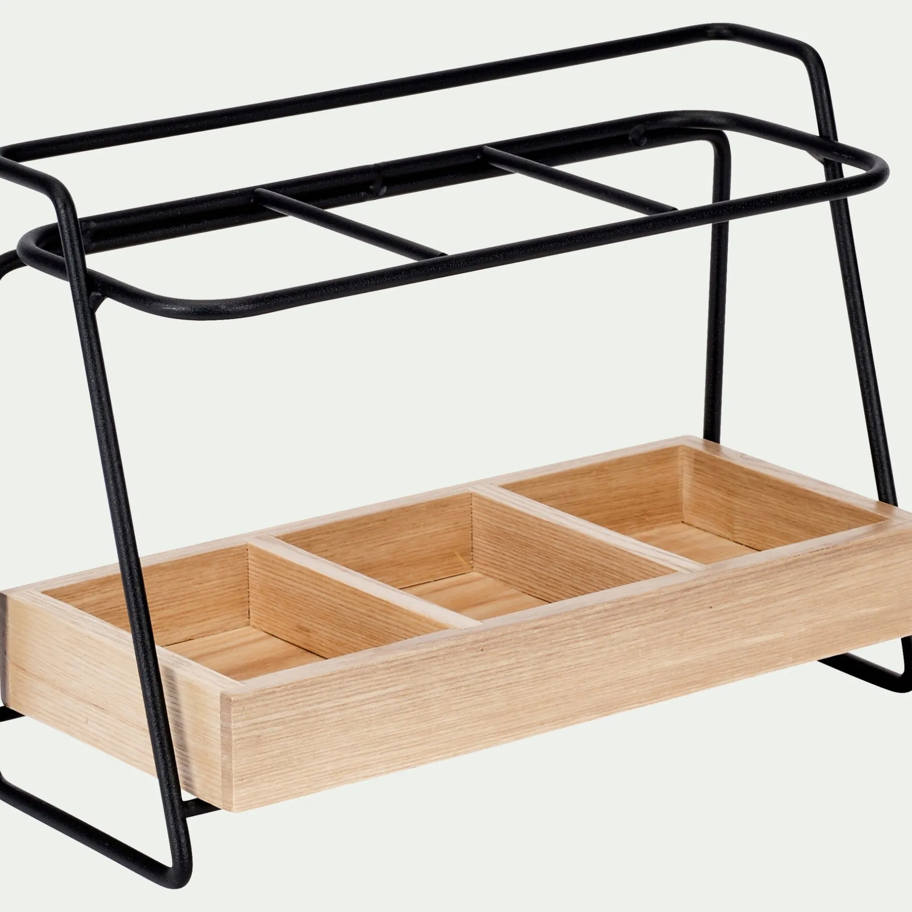 Un range couverts à 3 compartiments en bois et métal noir qui sera très pratique pour y ranger vos fourchettes, cuillères et couteaux. Une alliance de matières laissant émaner un esprit déco et authentique pour ce porte couverts que vous pourrez poser sur le plan de travail de la cuisine.