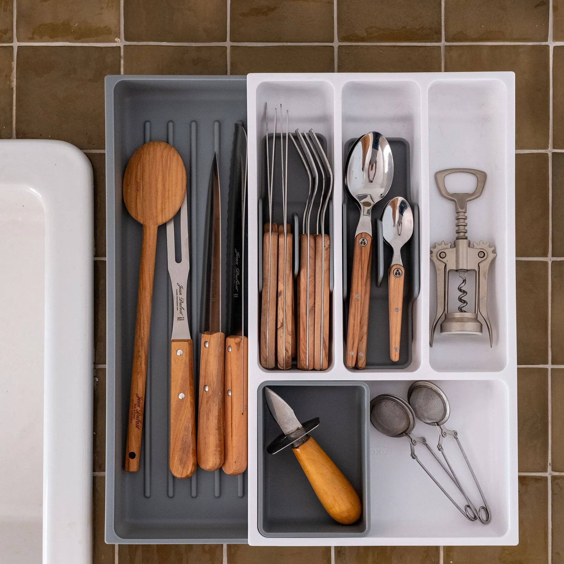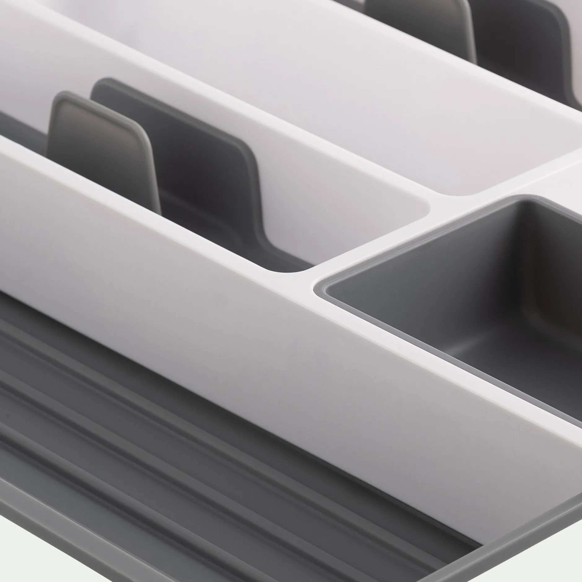 Découvrez cet organisateur de couverts en plastique, très pratique pour y ranger vos fourchettes, cuillères et couteaux. Ce range-couverts est muni d’un petit bac amovible qui vous permet aussi de mettre les plus petits ustensiles de cuisine que l’on égare souvent tels que les bouchons de vin. Ce porte-couverts trouvera aisément sa place sur le plan de travail de la cuisine ou dans un tiroir.