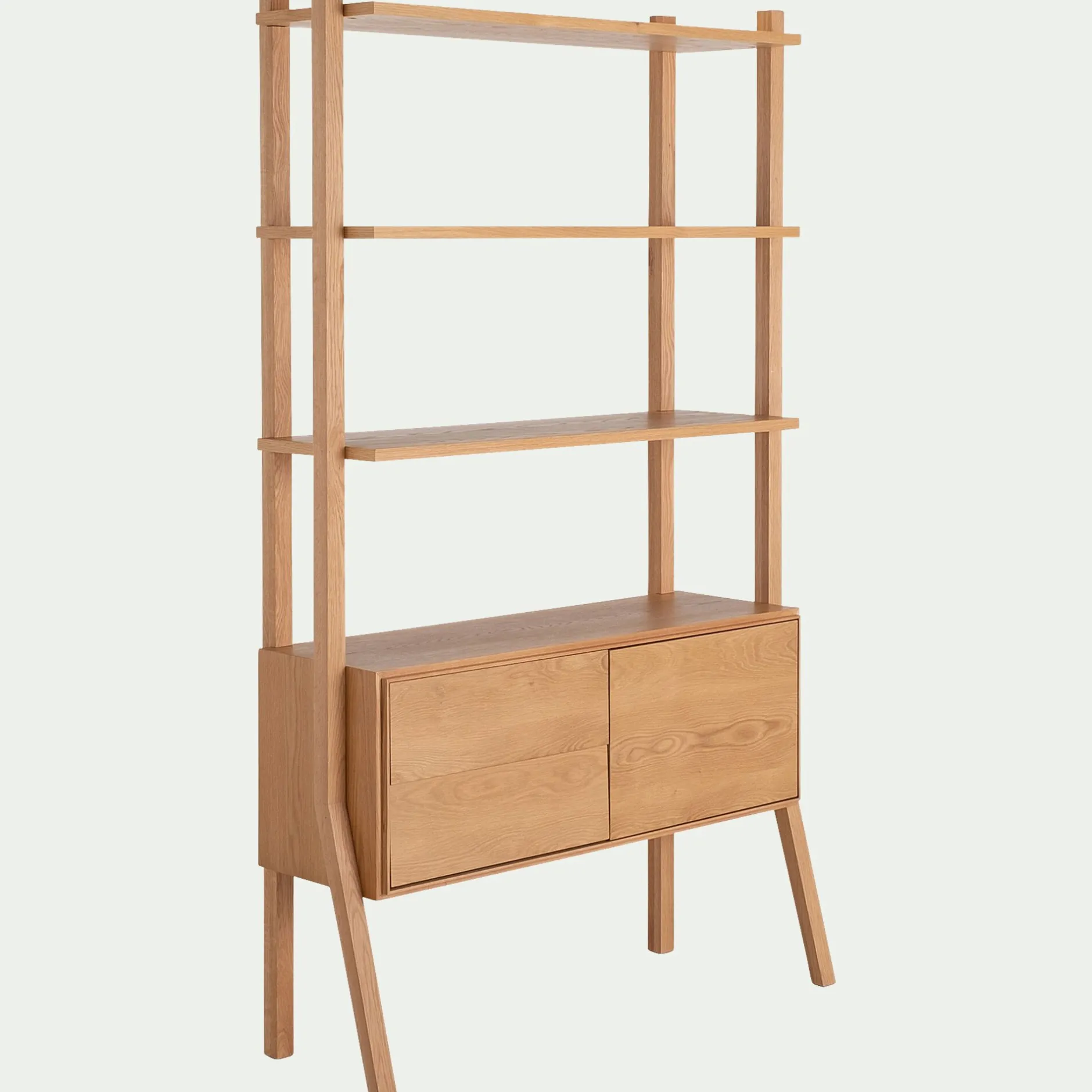 Grâce à ses lignes franches, cette bibliothèque arbore un design subtilement contemporain. D’apparence simple, elle cache pourtant un grand caractère que l’on retrouve par exemple dans son piètement légèrement biseauté. Confectionnée en chêne, cette bibliothèque au style naturel tire sa force de ses nombreux espaces de rangement. Elle se compose de 3 tablettes où exposer vos objets déco et livres, de 2 tiroirs coulissants pour vos accessoires de bureau et d’un placard qui s’ouvre sur deux casiers pour vos jeux de société. Fonctionnelle, cette étagère en bois est aussi belle que pratique. Dans le séjour ou le bureau, elle prend ses aises avec élégance et berce la décoration de son aura authentique.