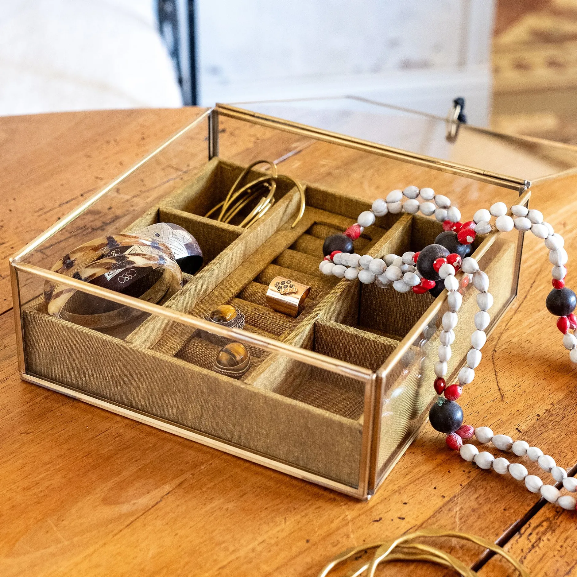 Cette jolie boite carrée est idéale pour y déposer vos bijoux afin qu’ils soient toujours rangés. Organizer votre chambre et ne perdez plus aucun de vos bijoux préférés grâce à ses petits rangements. Elle est composée de plusieurs compartiments qui vous permettent de classer vos bagues, colliers, bracelets et boucles d’oreilles. En laiton et en verre, elle donne un style raffiné à votre décoration. Posée sur votre table de nuit ou encore sur votre coiffeuse, elle apporte du cachet à vos meubles en rehaussant les designs les plus simples. Ce rangement de 21×21 cm est à la fois pratique et esthétique et donnera du charme à votre pièce.