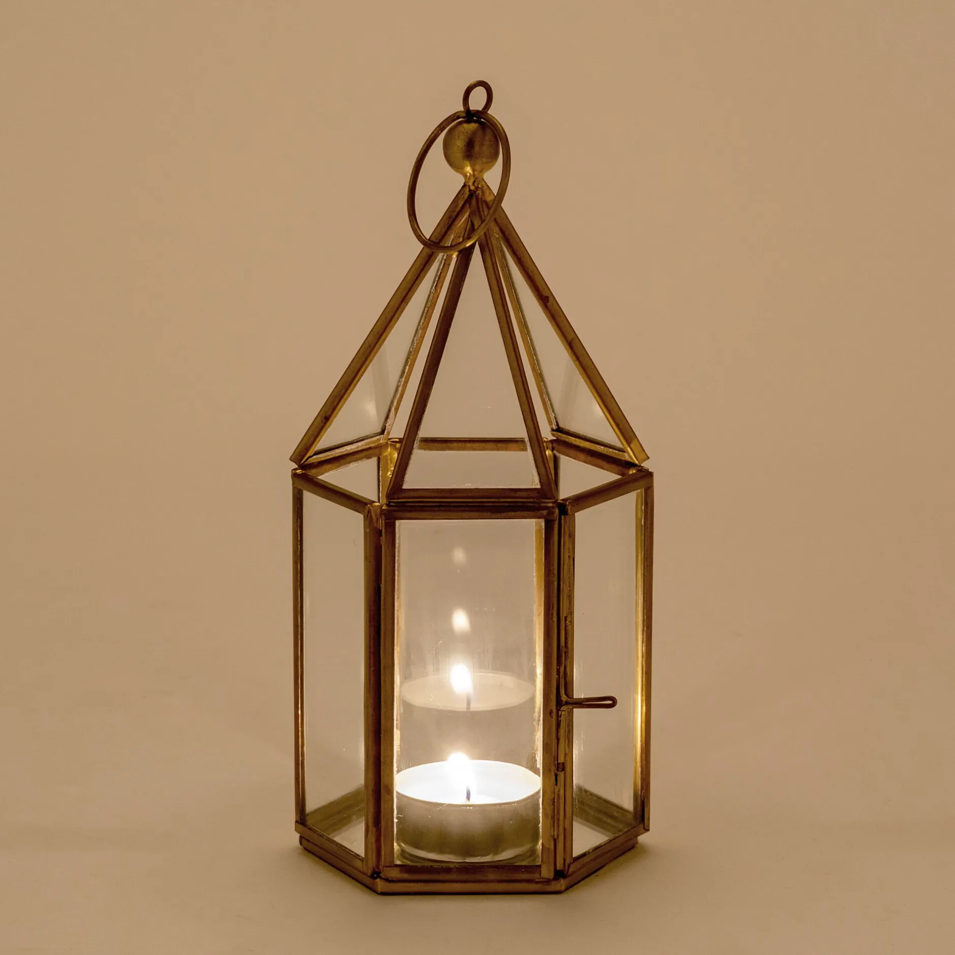 Laissez-vous charmer par cette lanterne photophore au design raffiné, mêlant le verre transparent à la délicatesse du laiton doré. Sa structure hexagonale en verre encadrée par des montants en laiton rappelle l’élégance des luminaires d’inspiration orientale, parfaite pour une ambiance chaleureuse. Posée sur une console ou une table d’appoint, cette lanterne décorative diffuse la lumière de votre bougie chauffe-plat avec une douceur unique. Grâce à sa poignée anneau, elle peut être facilement déplacée pour éclairer un coin de pièce ou créer une atmosphère intimiste sur un balcon pendant les fêtes. Elle s’harmonise aisément avec d’autres objets de décoration en métal ou en verre pour composer un intérieur au style intemporel. Adoptez ce photophore pour ajouter une touche d’éclat discret et d’élégance à votre maison.
