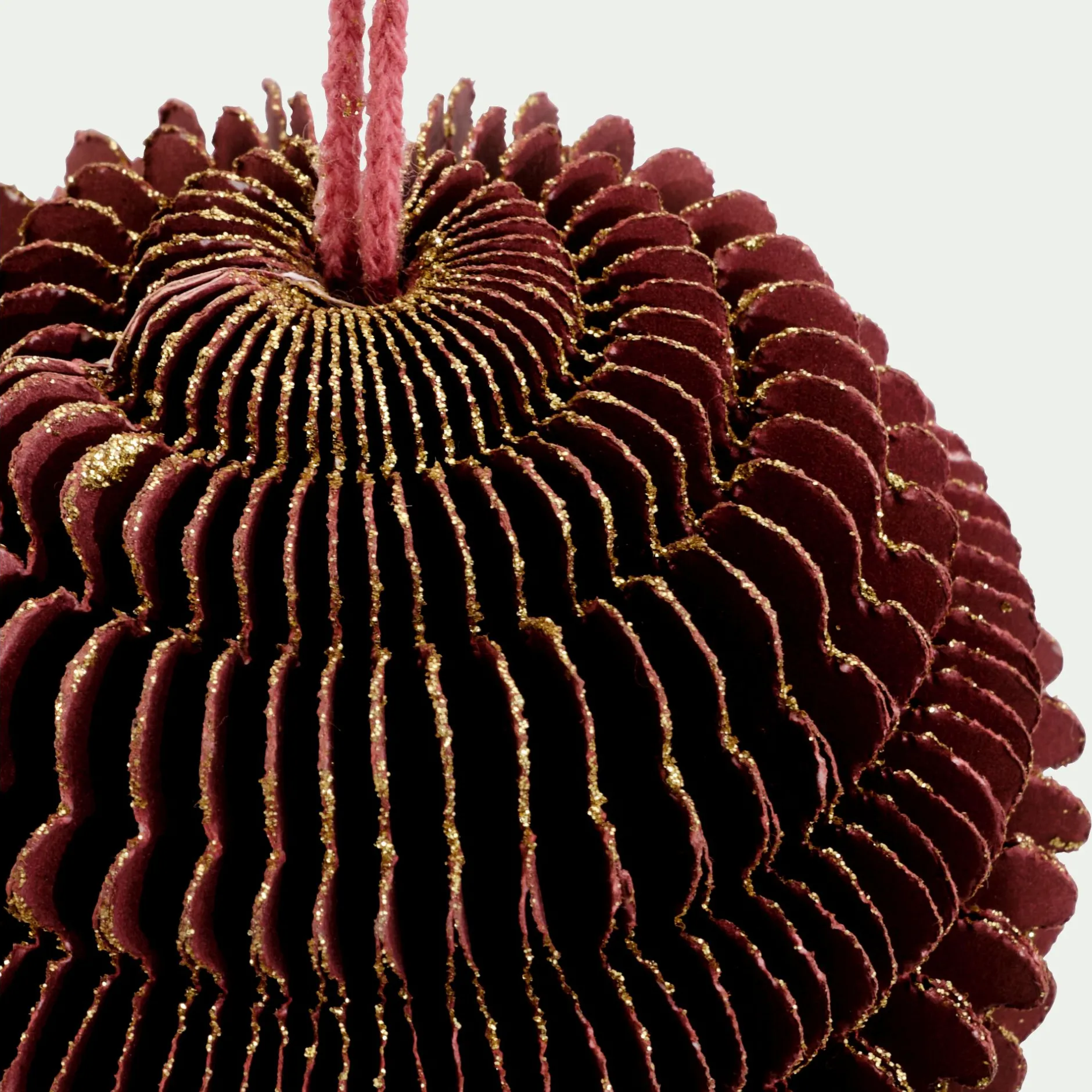 Donnez une allure unique à votre sapin avec cette décoration de Noël sphérique. Sa teinte rouge prune et ses accents dorés apportent une ambiance à la fois festive et sophistiquée à votre intérieur. Loin des boules traditionnelles, cette suspension en papier plissé se distingue par sa texture délicate et sa légèreté. Sa forme ronde et harmonieuse en fait un élément de choix pour décorer le sapin, mais aussi pour habiller une guirlande ou une composition florale. Elle s’intègre facilement à des décorations existantes tout en apportant une touche d’originalité pour des fêtes mémorables.