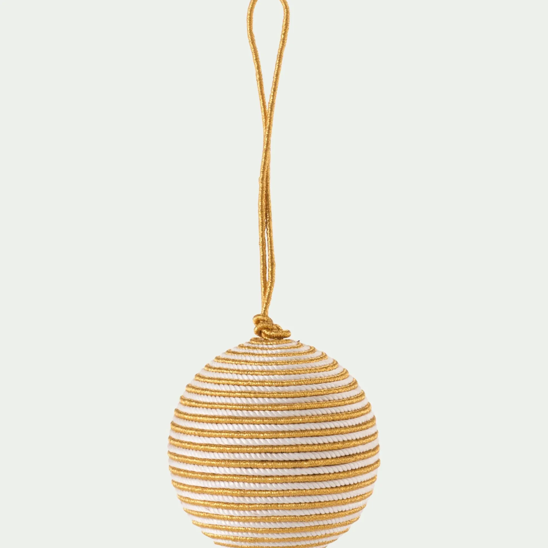 Cette jolie boule de Noël sera du plus bel effet dans votre sapin. Sa couleur dorée métallisée contraste parfaitement avec le blanc et lui donne ainsi un côté lumineux apprécié. Ses rayures irisées sont confectionnées en rayon et en zari, un fil utilise pour la broderie indienne. Ainsi, cet ornement fera scintiller votre arbre de mille feux. Pour accompagner votre boule, placez d’autres décorations dorées ou blanches pour créer une jolie harmonie de couleurs. Pour une saison hivernale féerique, rien de mieux qu’un sapin élégant.