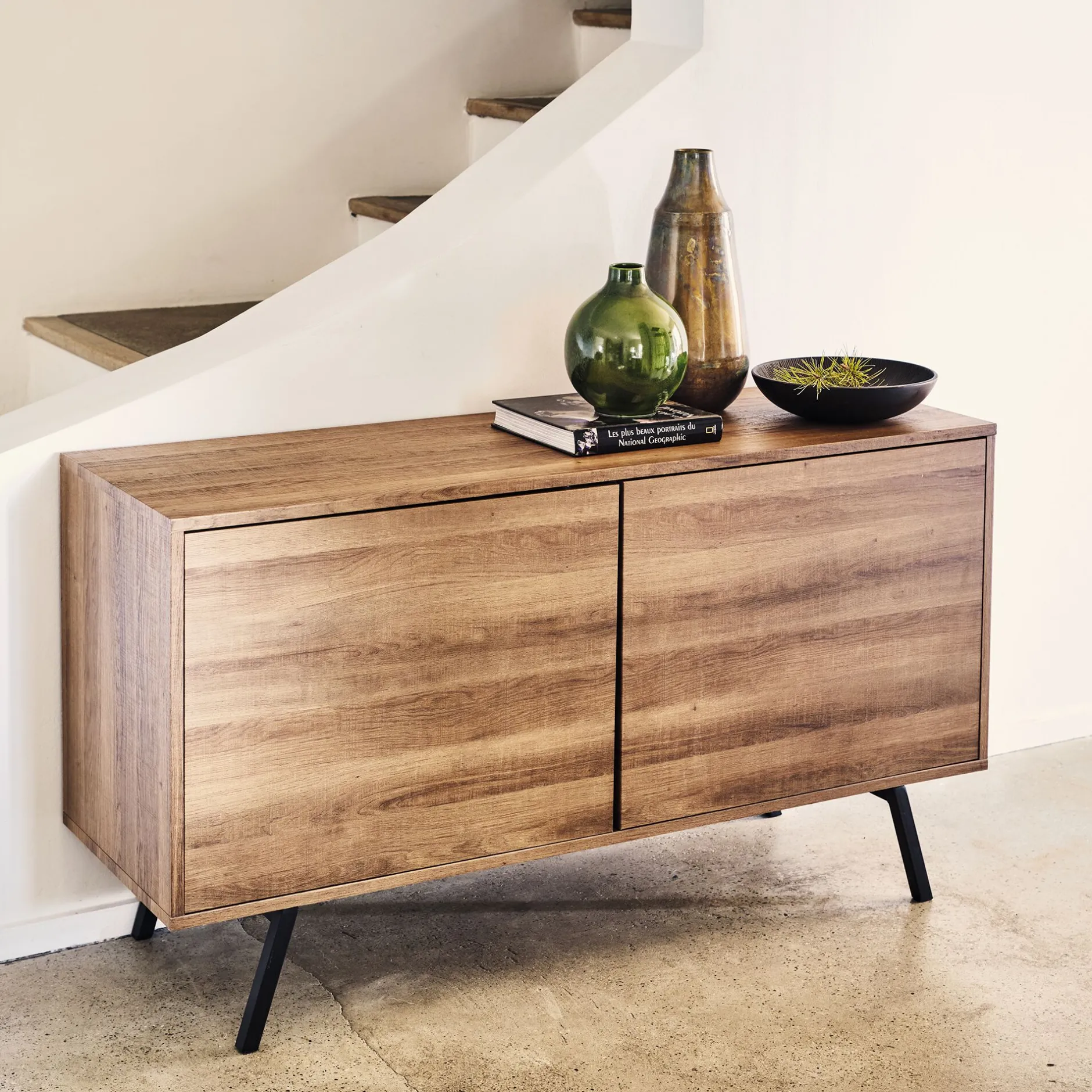 Le buffet est un élément indispensable au salon, car il est d’une grande aide afin d’entreproser assiettes, verre et autres pièces de vaisselle. Ce beau buffet doté de pieds en acier avec une finition biseautée, mixe à la perfection différentes matières pour donner du style à votre pièce de vie. Ces deux grandes porte et son design carré apporte un style unique et singulier tout en rendant l’ensemble élégant. Il est aussi parfait pour une maison au style atypique. De plus de son grand esthétisme, ce meuble est pratique grâce à ses étagères intérieures et sa tablette sur laquelle vous pouvez poser votre décoration. Ce buffet donnera à votre salon du raffinement.