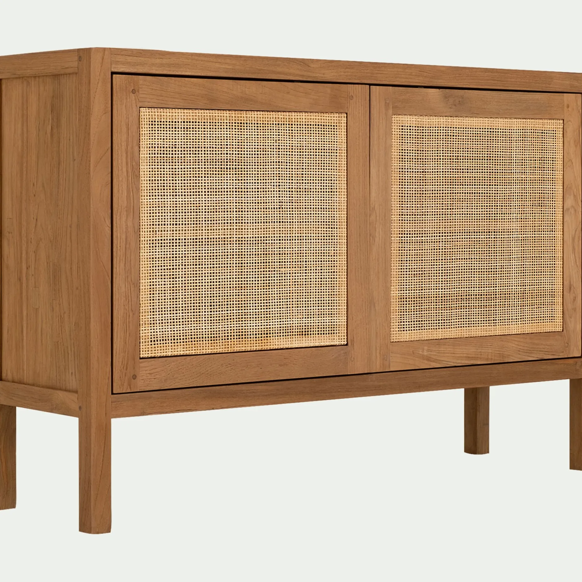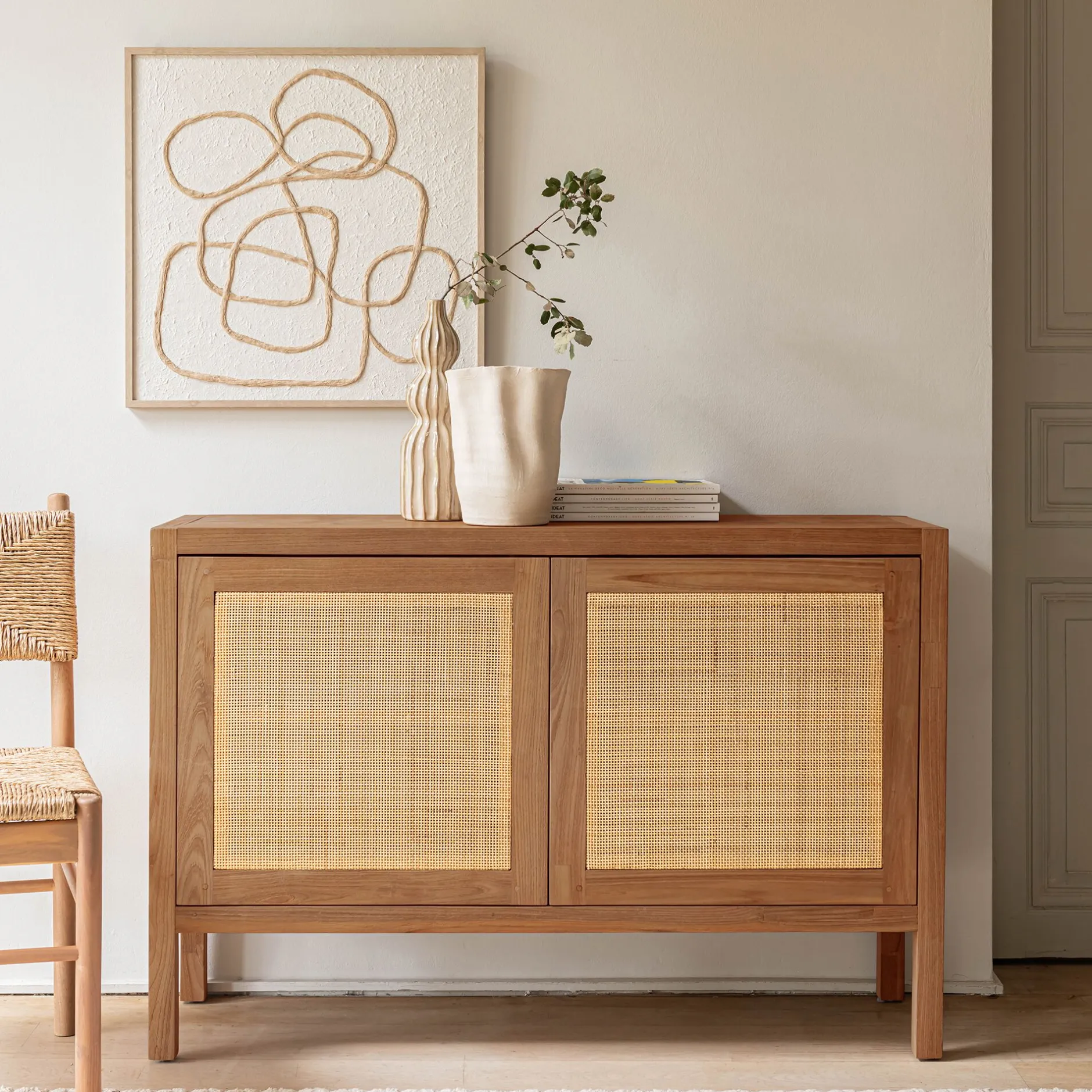 Ce buffet se joue des codes établis. Son mélange entre style urbain et authentique, mêlant graphisme et modularité en fait un meuble de salon audacieux. Sa structure en teck recyclé et son cannage lui donnent un aspect chaleureux et authentique. 2 portes en cannage battantes laissent apparaître de spacieux rangements dans lesquels vous pourrez disposer vos livres, vos appareils électroniques et autres objets du quotidien. Un meuble d’intérieur au design rempli de charme qui s’intégrera parfaitement dans votre pièce de vie.