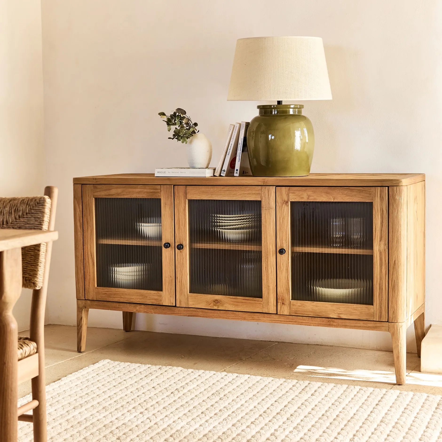 Le buffet bas en bois Leucade allie solidité et élégance grâce à ses portes vitrées, créant un équilibre harmonieux entre les matières. Son design imposant s’allège visuellement par la présence du verre, apportant une touche de délicatesse à l’ensemble. Les 3 portes battantes s’ouvrent sur 6 niches de rangement, idéales pour organiser la vaisselle, des livres ou des objets décoratifs. Fonctionnel et esthétique, ce buffet enrichit le salon et facilite le quotidien avec un espace de rangement pratique et élégant.