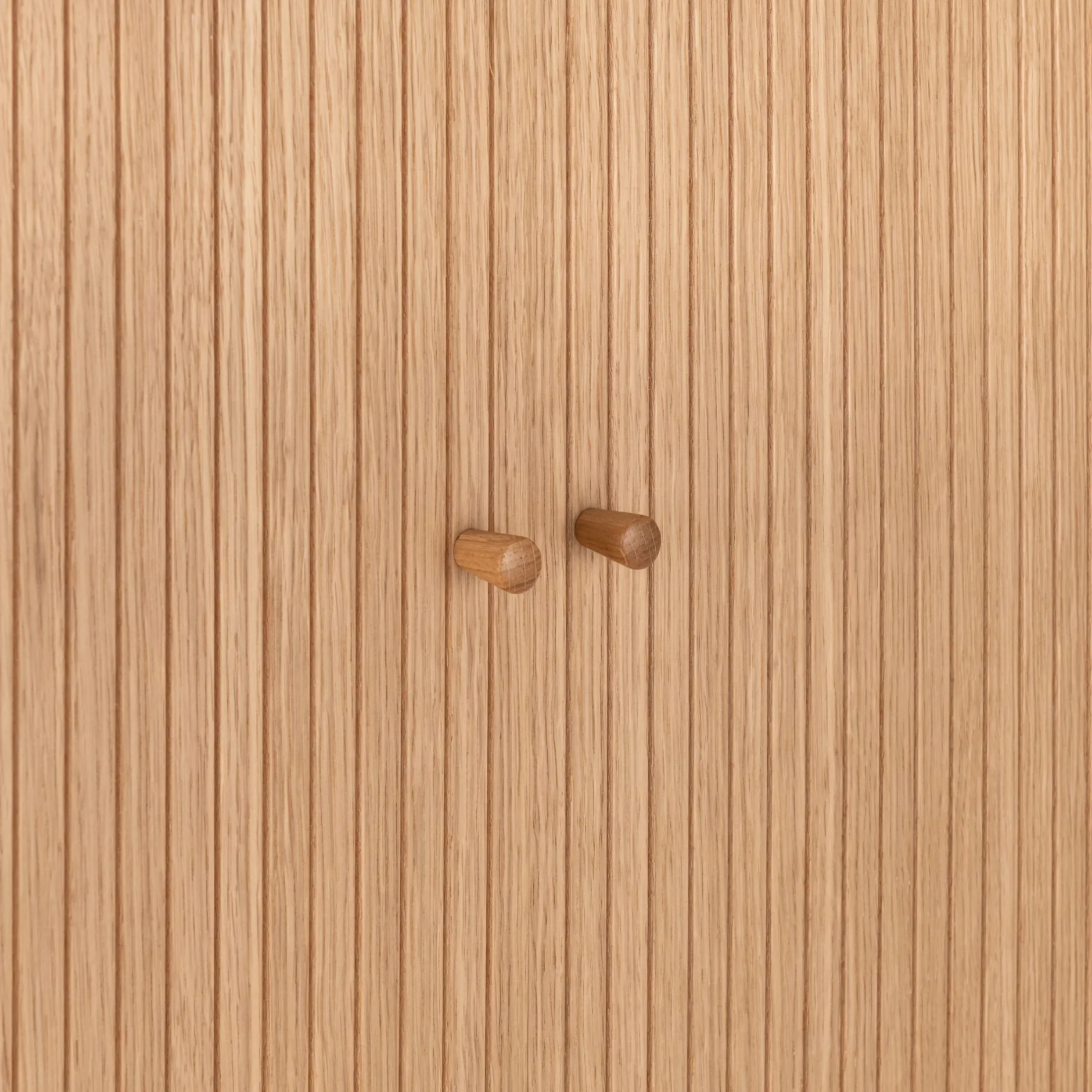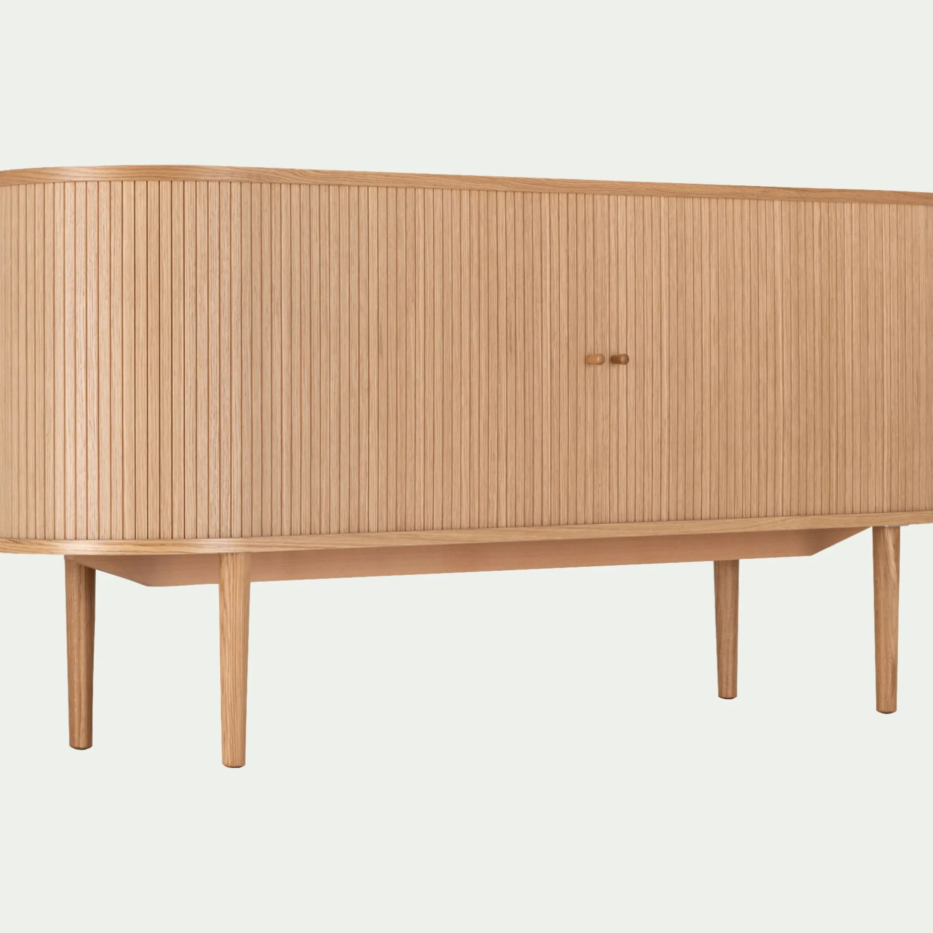 Jozo est un sublime buffet décoratif, à l’aura douce et exotique. Ce buffet bas présente une forme ovale : ses angles arrondis invitent à la détente et viennent apaiser l’atmosphère. Cette forme si particulière permet aux deux portes cannelées de coulisser le long du meuble. Cette ouverture atypique apporte du charme à ce buffet et au séjour tout entier. Ce buffet en bois arbore un coloris naturel, celui du chêne : une essence claire et striée de fines veinures. Ce buffet naturel est composé de quatre espaces de rangement, faisant de lui l’allié parfait d’un salon ordonné et agréable à vivre.