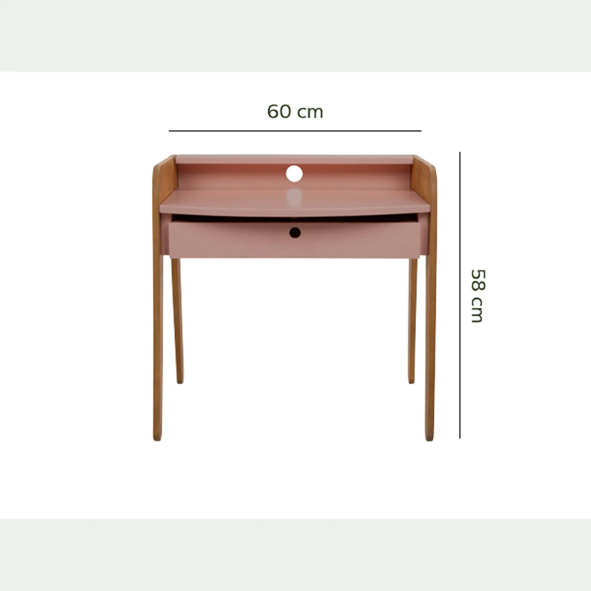 Bois acacia + MDF. (panneau de fibres de moyenne densité) en finition huilé couleur teck et finition lasuré rose.