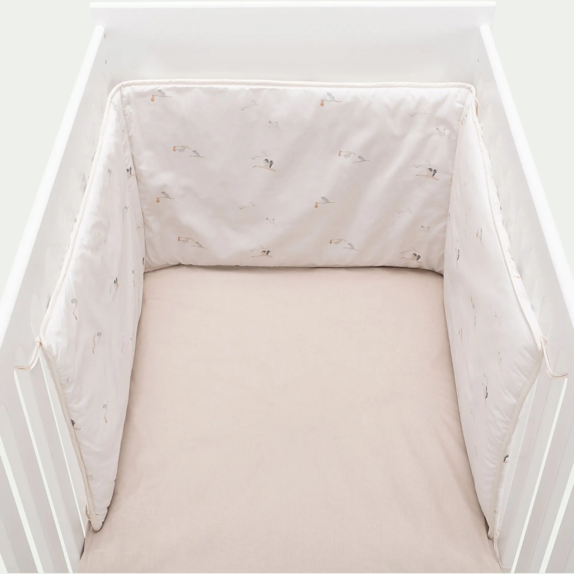 Ce tour de lit, conçu pour un lit bébé à barreaux de 60×120 cm, allie sécurité et douceur. En coton bio, il offre un contact naturel et respectueux de la peau délicate de bébé. Son motif de cigognes en plein envol, imprimé sur un fond blanc apaisant, crée une ambiance sereine propice au repos. Placé autour des barreaux, le tour de lit protège bébé des chocs et évite les courants d’air, tout en apportant une touche décorative harmonieuse à la chambre.