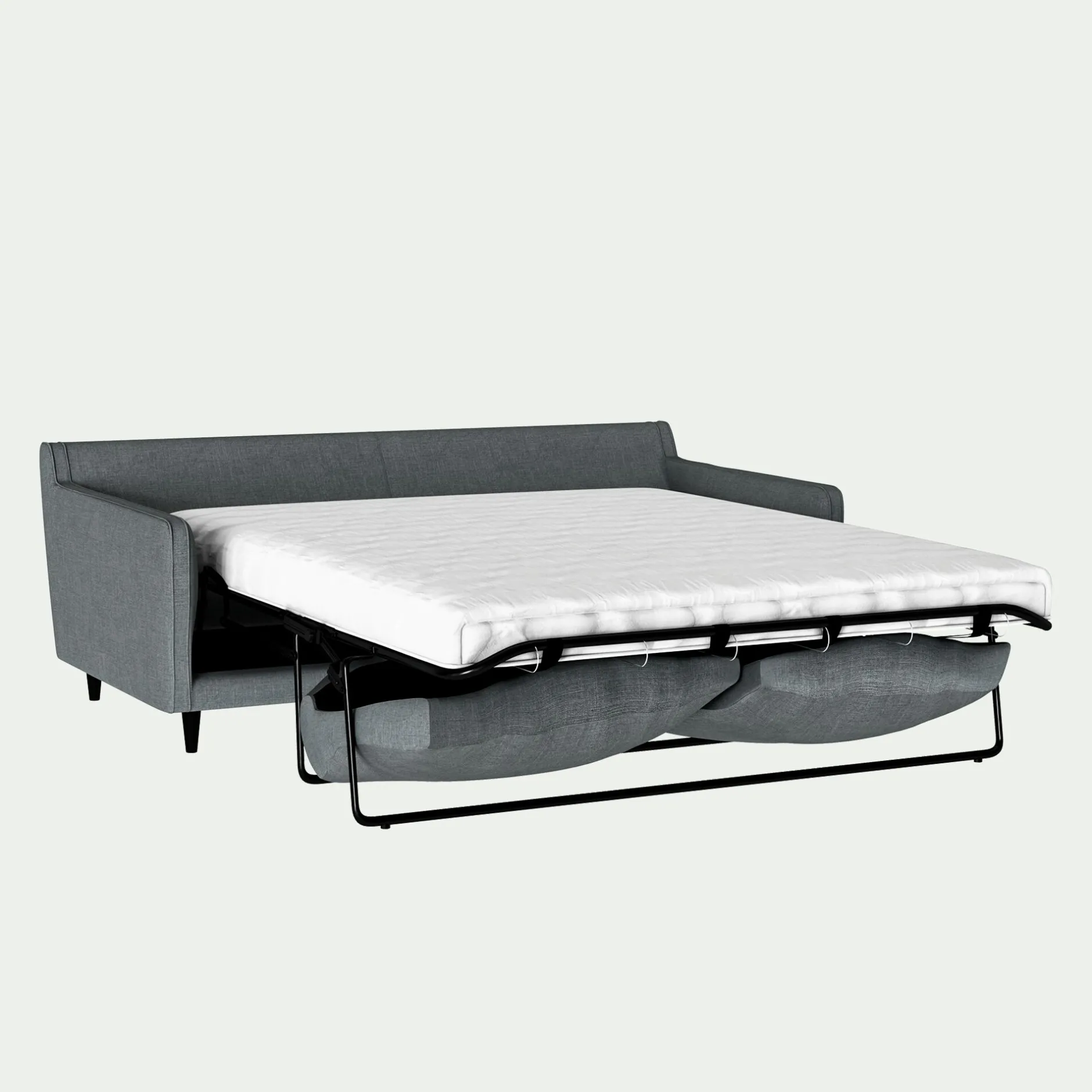 Couchage d’appoint matelas 140×185 cm, canapé convertible ouvert L.200 x P.230 cm.