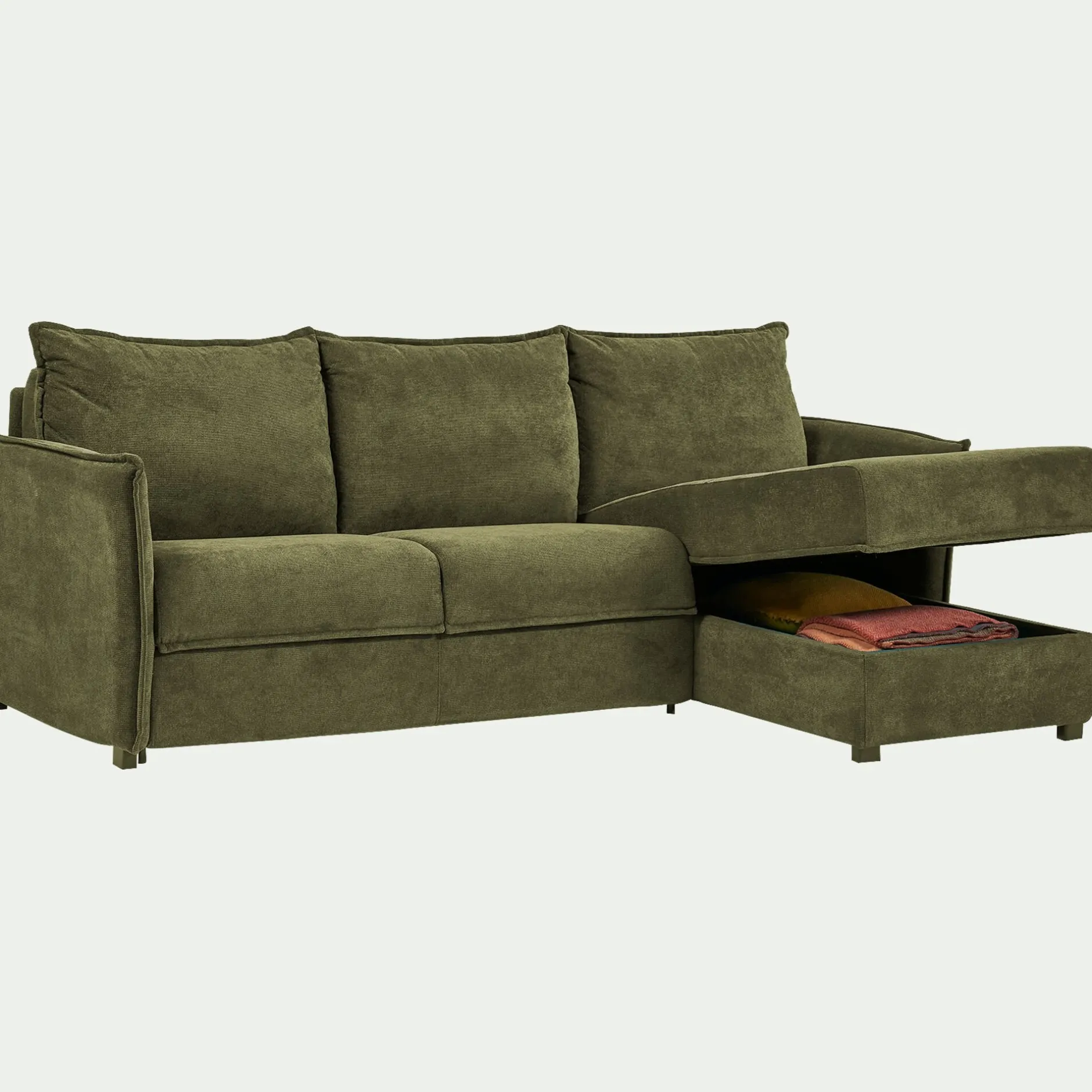 Le canapé Moya offre un soutien optimal adapté à chaque partie du corps. Ce canapé d’angle convertible à la fabrication italienne, confectionné à partir du savoir faire local, vous permet de vous détendre dans une pièce hautement qualitative. Le soir, dépliez votre canapé et transformez-le en un lit au couchage 140×195 cm d’une densité de 25kg/m3 qui vous permettra d’accueillir famille et amis. Très confortable, ce canapé peut servir de couchage quotidien. Son mécanisme métallique vous permet de le déplier en quelques secondes sans enlever ses coussins. Ce canapé en tissu, avec sa couleur vert cèdre et son liseré décoratif, apportera de l’élégance à votre salon.