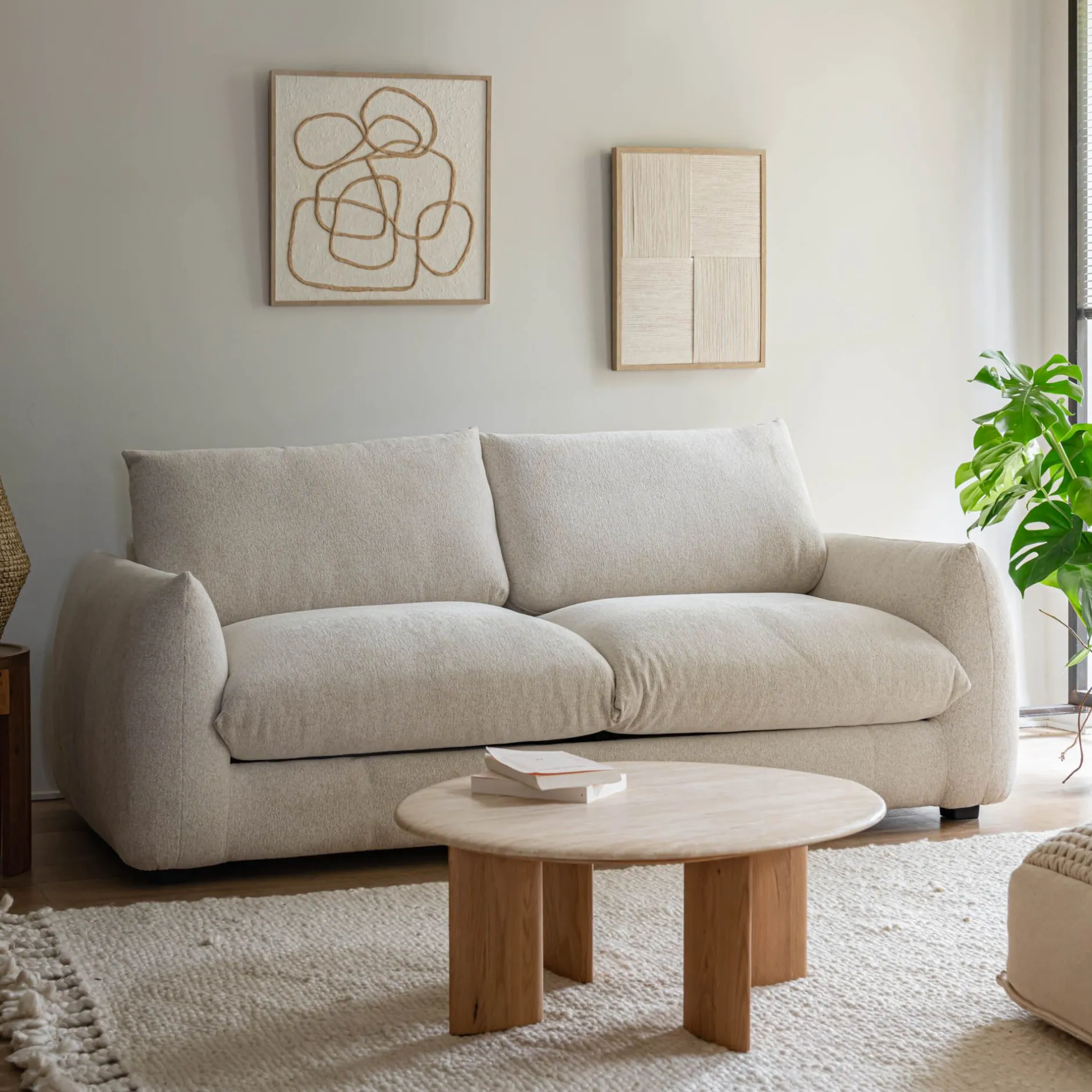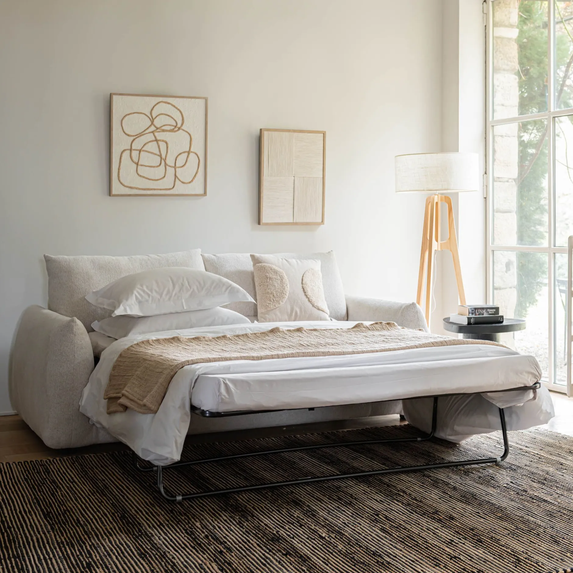 Le canapé Clovis allie confort et fonctionnalité avec élégance. Fermé, il se présente comme un canapé droit 3 places au design épuré, revêtu d’un tissu tramé blanc écru qui apporte douceur et raffinement à la décoration. Ses accoudoirs, son dossier et son assise généreusement rembourrés offrent un confort moelleux, parfait pour les instants de détente. Son principal atout réside dans un système express qui permet de le transformer en lit d’appoint 140×190 cm en un clin d’œil. Idéal pour un couchage occasionnel, il assure des nuits paisibles sans compromis sur l’esthétique. Déhoussable, ce canapé convertible conjugue praticité et élégance pour un entretien facilité. Avec son allure cocooning et son revêtement texturé, ce canapé en tissu insuffle une atmosphère chaleureuse et sophistiquée à votre intérieur.