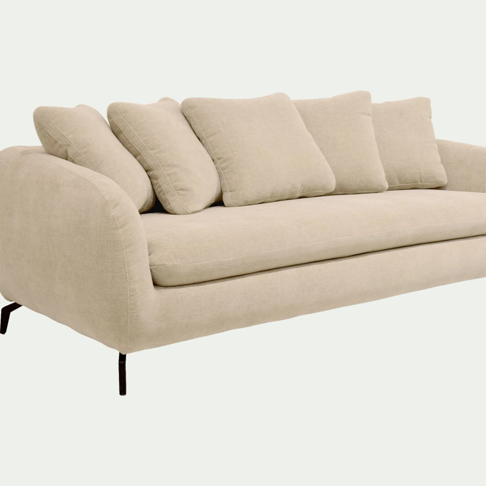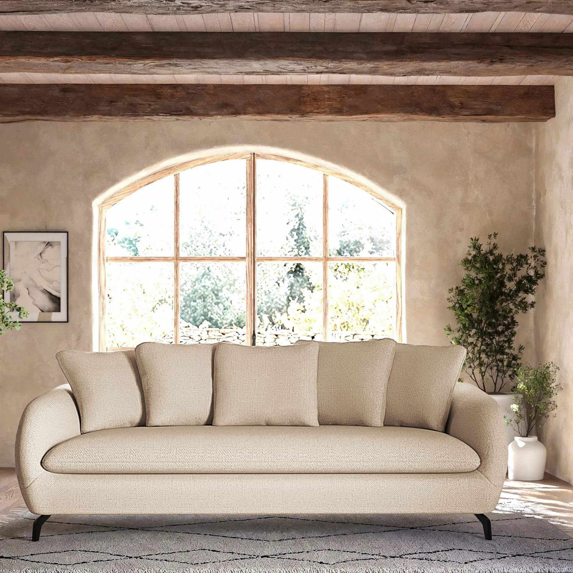 Un joli canapé 4 places convertible en tissu pour profiter agréablement de votre salon. Un look contemporain et accueillant, sublimé par un piétement original en acier noir. Vous apprécierez la forme du dossier et des accoudoirs qui vous offrent un maintien optimal de votre dos pour un confort d’assise exceptionnel. Un canapé fabriqué en France, dans des ateliers proches de la ville de Bourges, qui incarne l’excellence du savoir-faire français. Un coloris blanc écru qui apporte une note citadine et raffinée à votre décoration de salon.