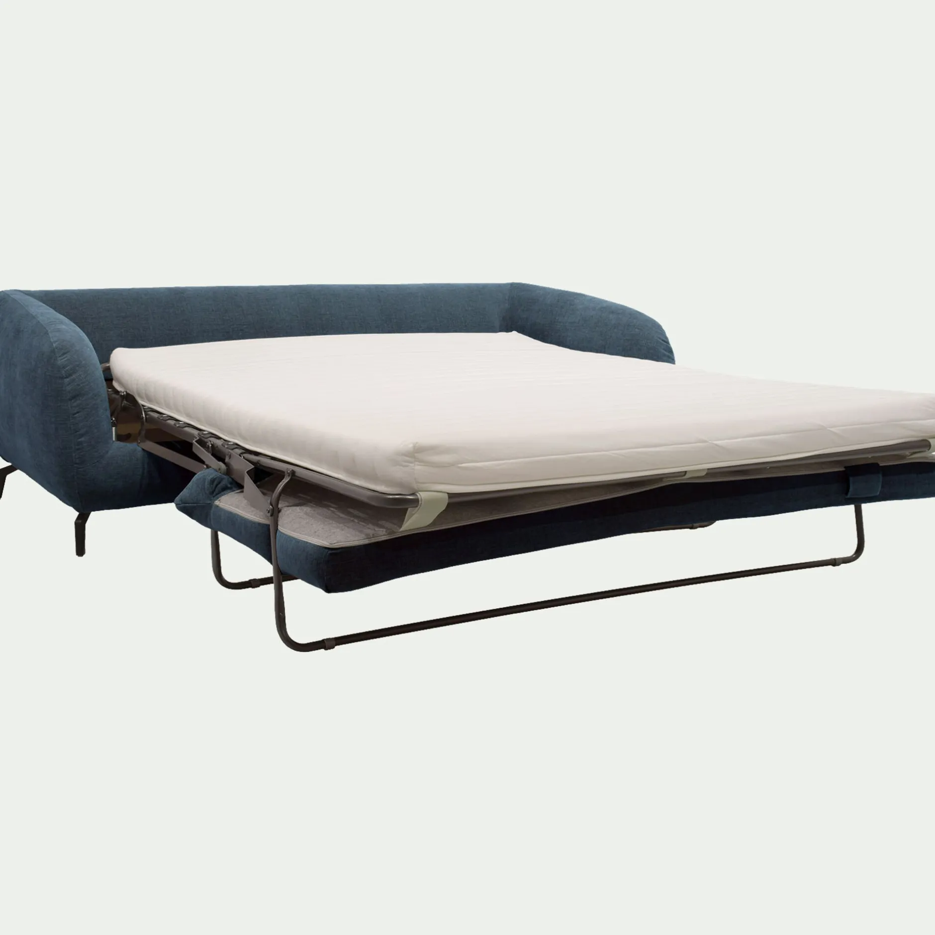 Un joli canapé convertible en tissu pour profiter agréablement de votre salon. Un look contemporain et accueillant, sublimé par un piétement original en acier noir. Vous apprécierez la forme du dossier et des accoudoirs qui vous offrent un maintien optimal de votre dos pour un confort d’assise exceptionnel. Un canapé fabriqué en France, dans des ateliers proches de la ville de Bourge, qui incarne l’excellence du savoir-faire français. Un coloris bleu qui apporte une note lumineuse et tendance à votre déco de salon.