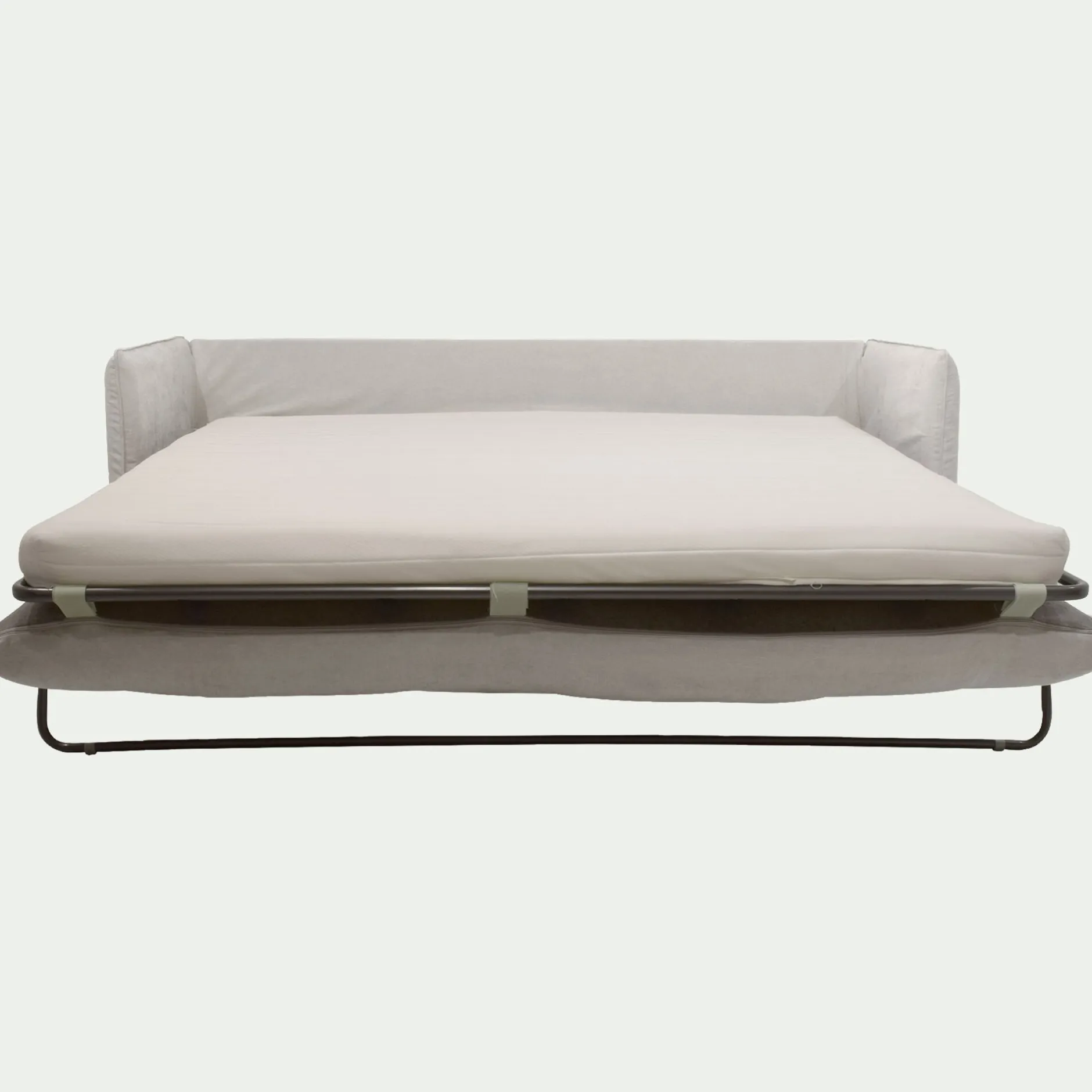 Couchage : sommier en acier dépliable 2 plis à lattes en hêtre multiplis + 1 pli sangles élastiques. Avec matelas en mousse polyuréthane Haute Résilience 30kg/m3 épaisseur fini 10 cm.