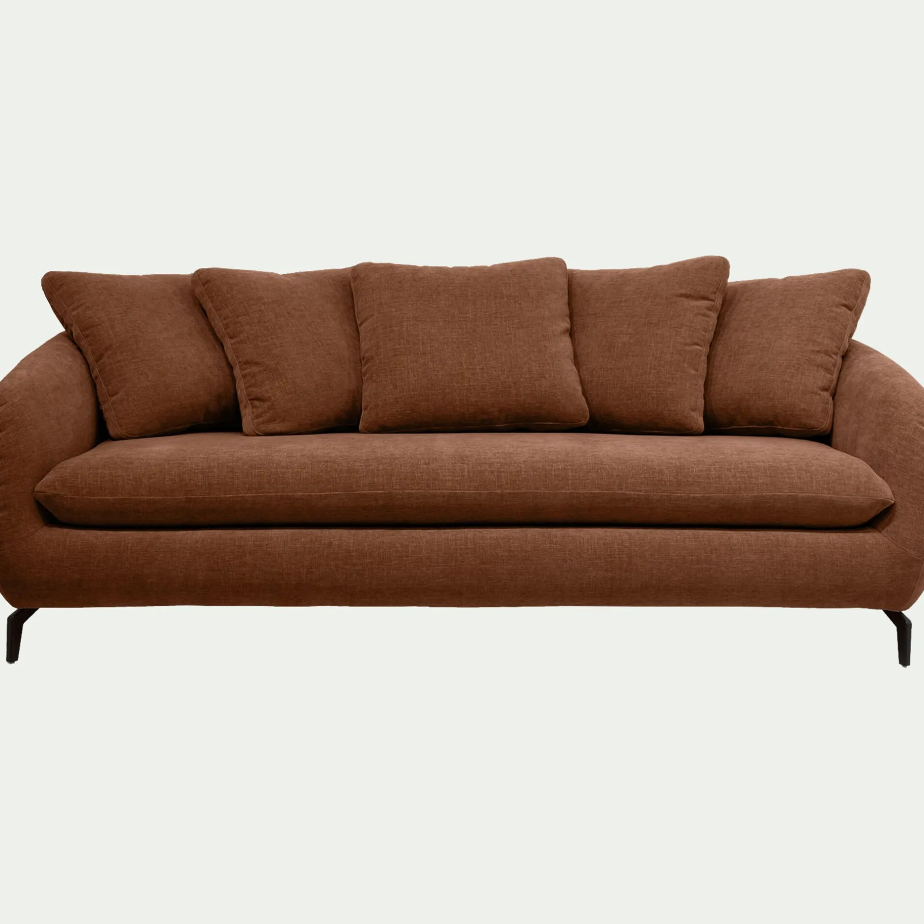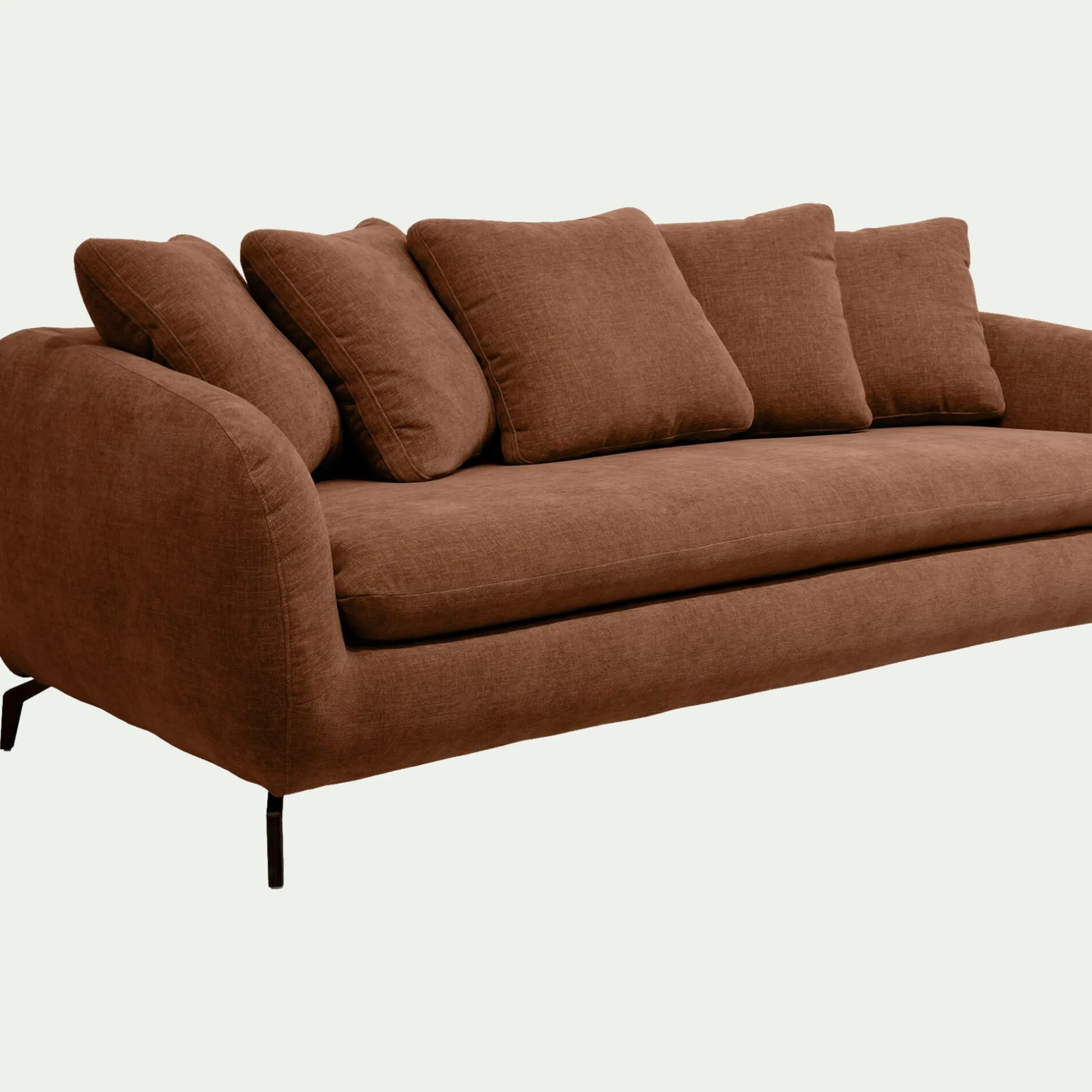 Un joli canapé fixe en tissu pour profiter agréablement de votre salon. Un look contemporain et accueillant, sublimé par un piétement original en acier noir. Vous apprécierez la forme du dossier et des accoudoirs qui vous offrent un maintien optimal de votre dos pour un confort d’assise exceptionnel. Un canapé fabriqué en France, dans des ateliers proches de la ville de Bourge, qui incarne l’excellence du savoir-faire français. Un coloris brun rustrel qui apporte une note lumineuse et chaleureuse à votre décoration de salon.