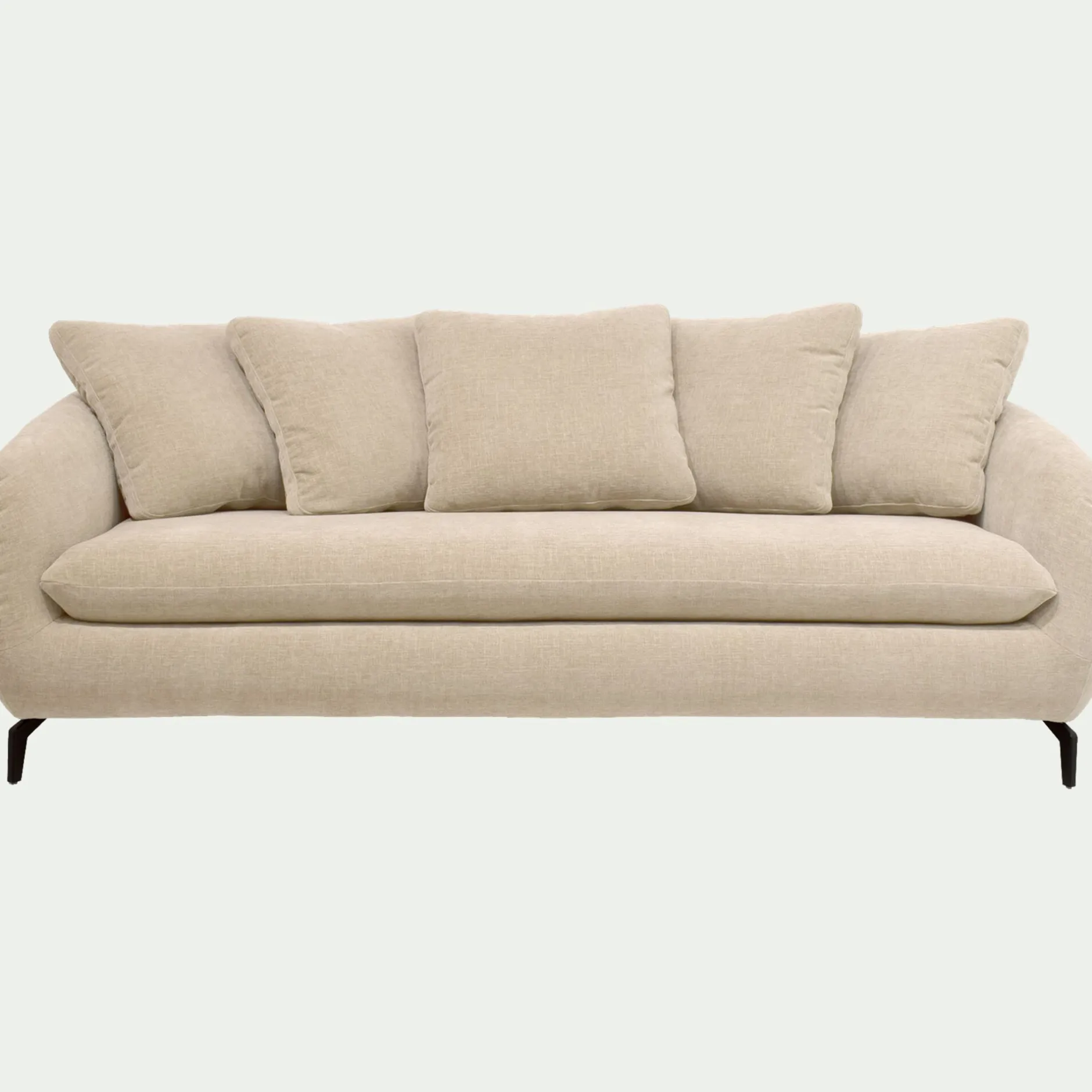 Un joli canapé fixe en tissu pour profiter agréablement de votre salon. Un look contemporain et accueillant, sublimé par un piétement original en acier noir. Vous apprécierez la forme du dossier et des accoudoirs qui vous offrent un maintien optimal de votre dos pour un confort d’assise exceptionnel. Un canapé fabriqué en France, dans des ateliers proches de la ville de Bourge, qui incarne l’excellence du savoir-faire français. Un coloris beige roucas qui apporte une note lumineuse et chaleureuse à votre décoration de salon.