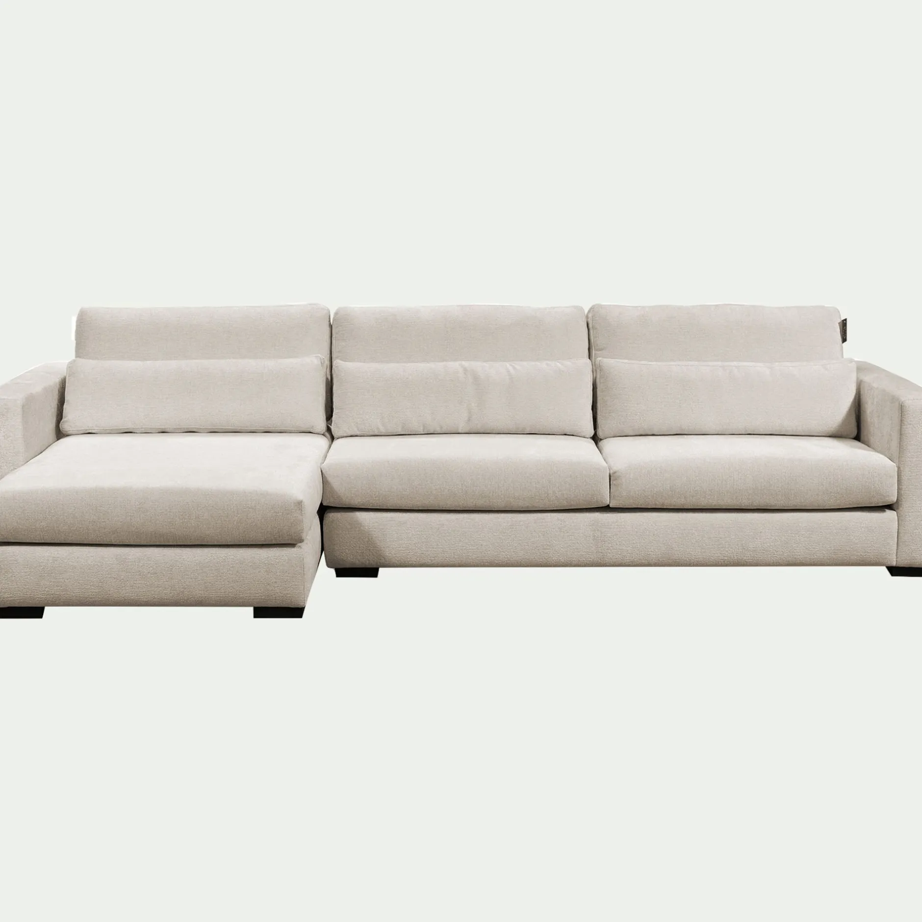 Généreux et élégant, le canapé d’angle Batis avec angle à gauche est idéal pour aménager un grand séjour. La chaise longue offre un espace idéal pour s’allonger et profiter d’un véritable moment de repos. Son revêtement en tissu tramé, à la fois doux et résistant, ajoute une touche d’élégance tout en assurant un confort optimal. Ce canapé fixe présente une couleur beige, douce, lumineuse et raffinée. Solide, ce canapé d’angle en tissu repose sur une structure en bois massif. Son design contemporain en fait une pièce phare du salon, où se mêlent convivialité et bien-être.
