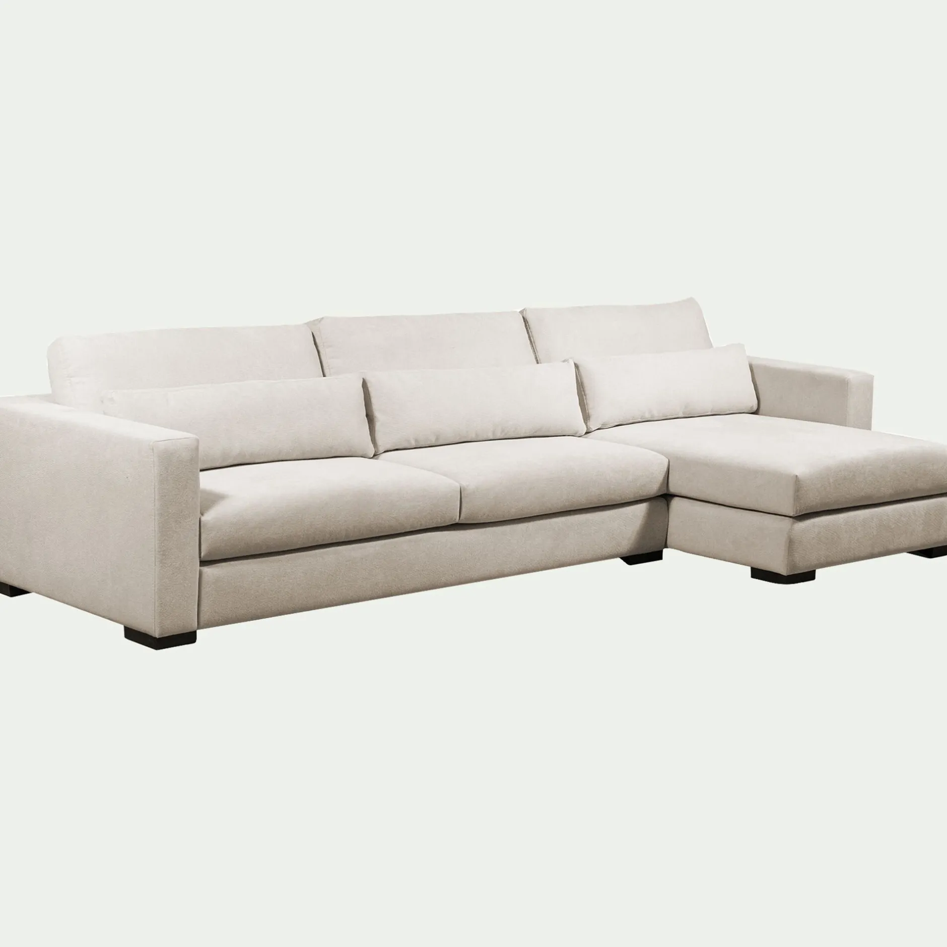 Ce canapé grand angle extrêmement confortable sera parfait pour vous relaxer. Fabriqué en Europe, il constitue le canapé fixe idéal pour recevoir vos convives grâce à ses 5 places assises. Son revêtement en tissu doux apportera une touche chaleureuse à l’ensemble de votre salon. Sa couleur beige roucas, ajoutera une touche de modernité à votre intérieur. Ce canapé angle droit sublimera votre salon.