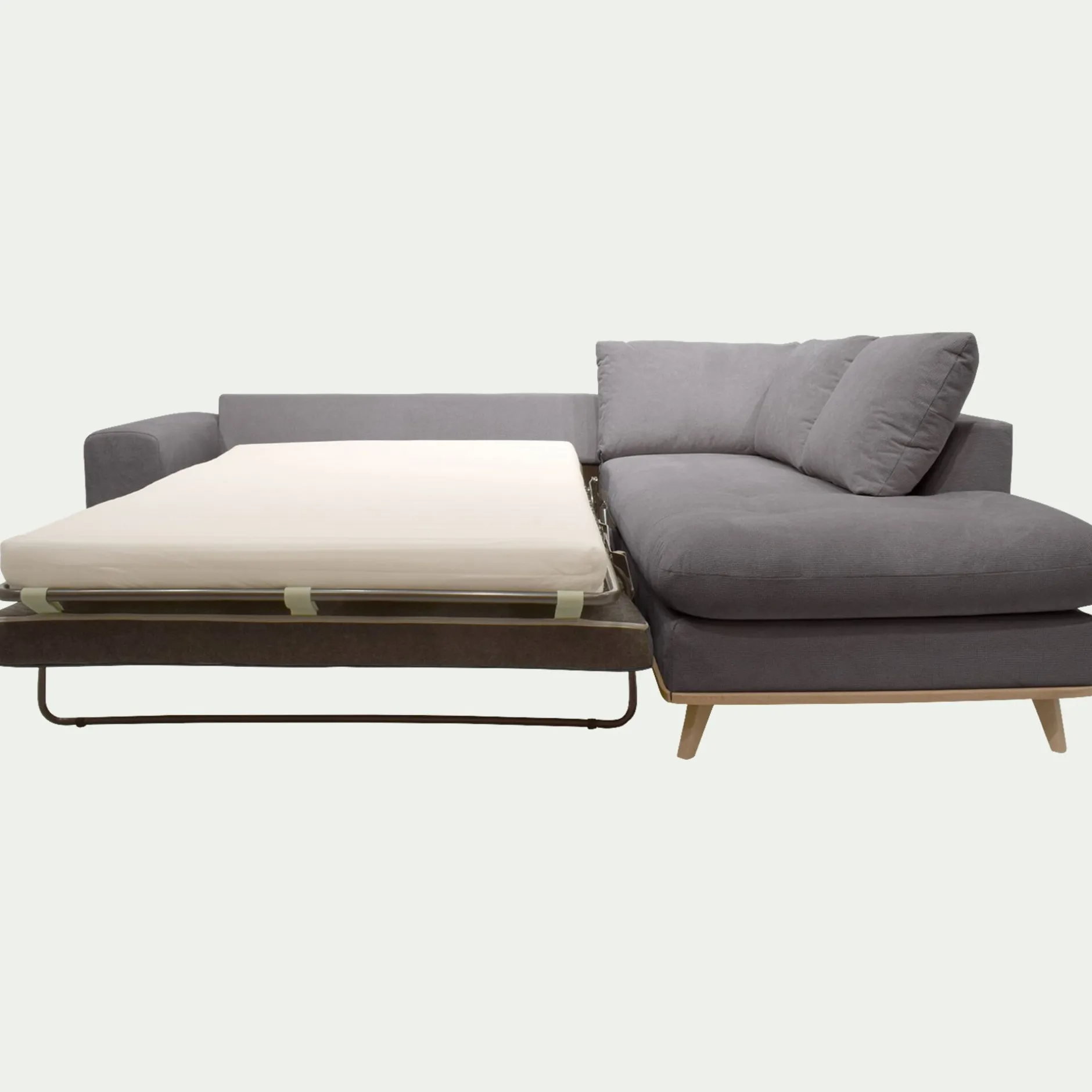 Le canapé d’angle convertible Capia allie confort, style et praticité. De jour, il offre une assise spacieuse pour 5 personnes grâce à son angle à droite. Ce canapé est alors revêtu d’un tissu Crown dans notre coloris gris restanque, moderne et apaisant. Son tissage certifié Oeko-Tex apporte douceur et résistance, parfait pour une utilisation quotidienne. Le soir, il se transforme en un couchage d’appoint de 120×190 cm grâce à un mécanisme d’ouverture rapide et facile, intégrant un sommier et un matelas pour un confort optimal. Son design repose sur une structure en pin massif et des pieds en hêtre massif, gage de solidité et de durabilité. Les coussins de dos déhoussables facilitent l’entretien. Une fabrication française qui conjugue esthétique et fonctionnalité.