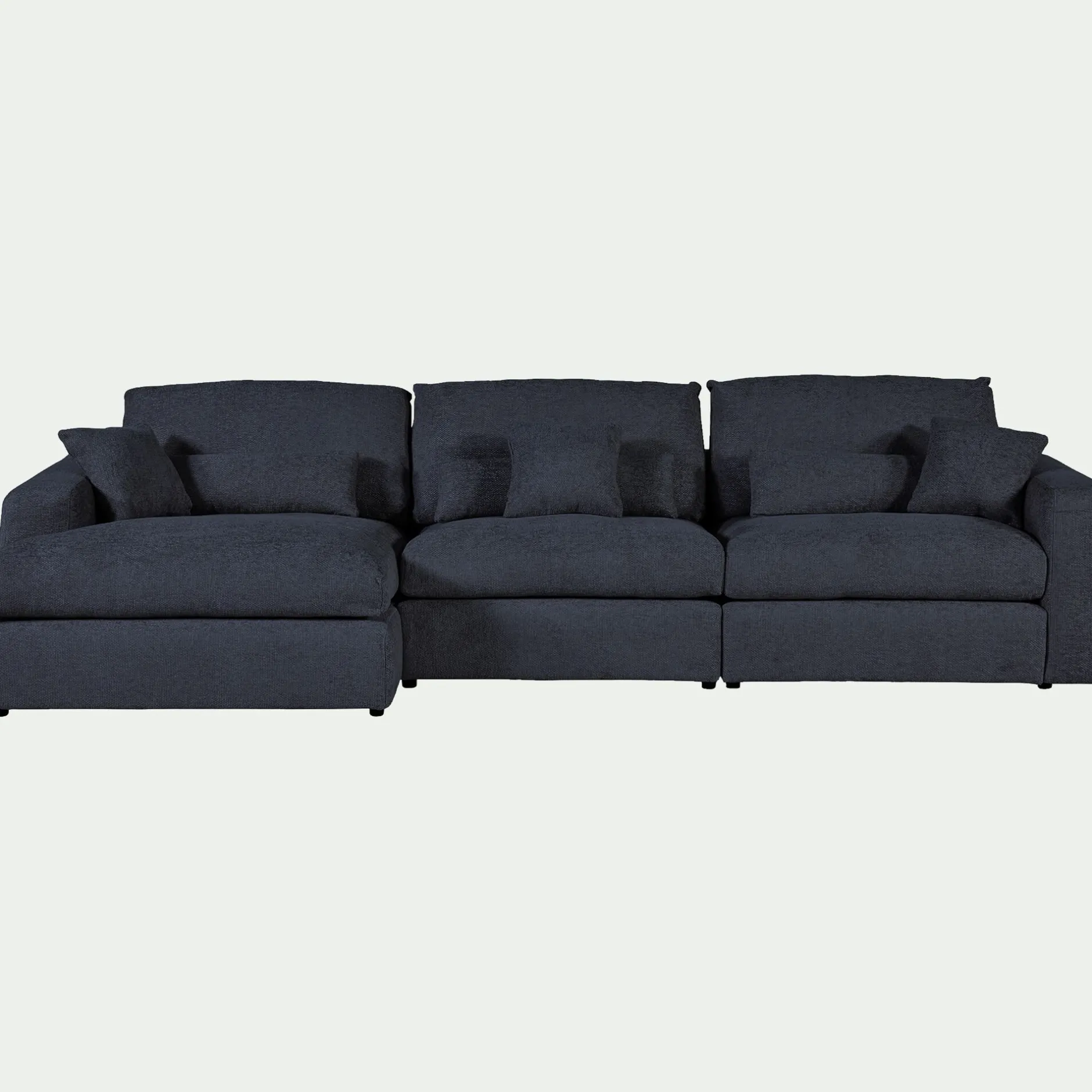 Avec son format généreux 5 places et son angle à gauche, ce canapé d’angle est une invitation aux moments partagés. Son revêtement en tissu chenille, à la fois doux et résistant, enveloppe l’espace d’une chaleur réconfortante. Son coloris bleu marine, intemporel, s’harmonise avec tous les styles d’intérieur. Pensé pour le confort, ce canapé fixe se compose d’une assise spacieuse, d’un dossier accueillant et de coussins déhoussables pour un entretien facilité. Six coussins décoratifs viennent parfaire l’ensemble, ajoutant une touche cosy. Un canapé idéal pour des instants de détente en famille ou entre amis.