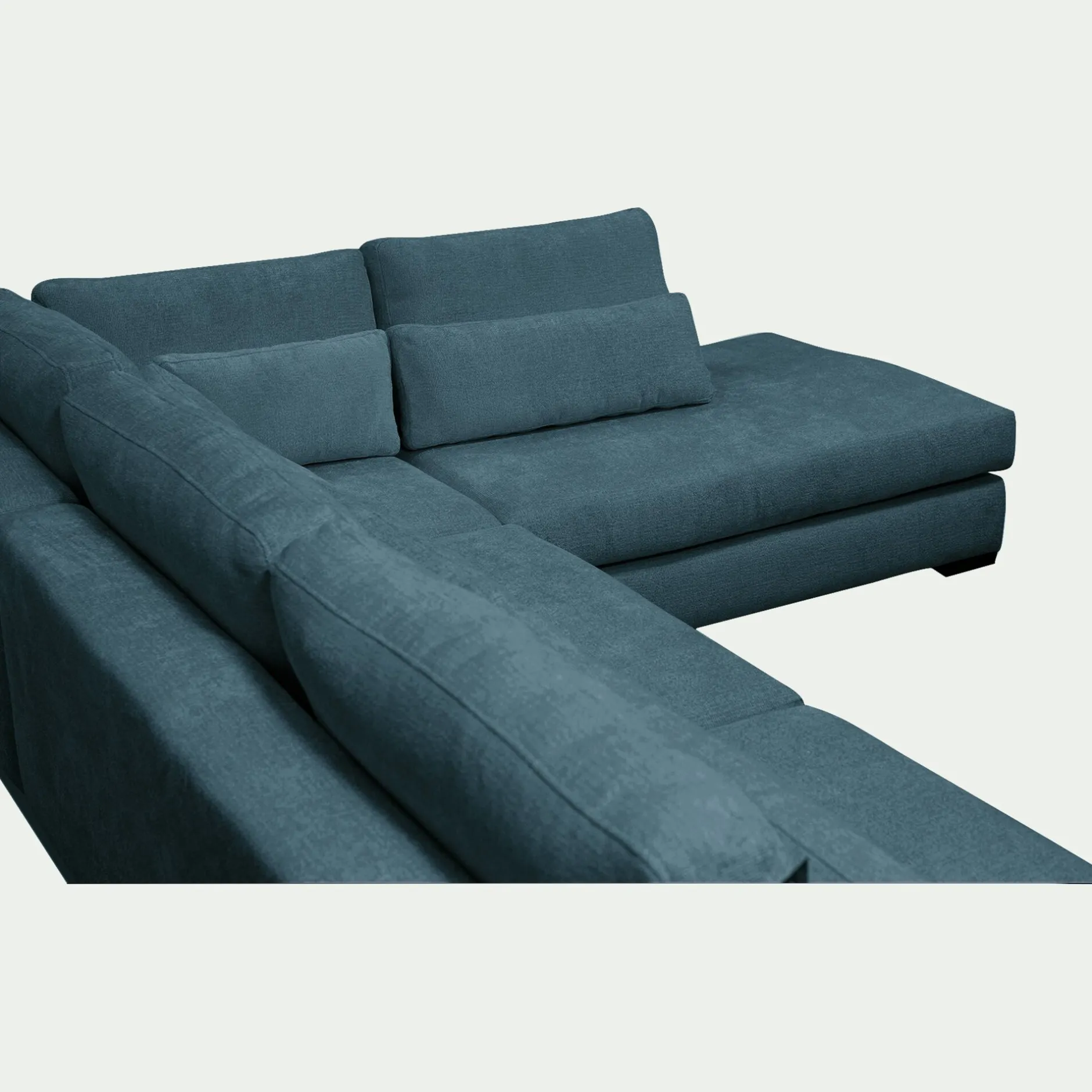 Ce canapé d’angle avec méridienne à droite transforme votre intérieur en un espace bien-être. Son format généreux accueille toute la famille ou permet de s’allonger entièrement après une journée de travail. Revêtu d’un tissu bleu à la fois apaisant et revitalisant, il séduit par sa texture douce et résistante. Son assise profonde repose sur une structure en bois massif et des ressorts qui garantissent un maintien souple et durable. Pratique, ses coussins de dossier et d’assise sont déhoussables pour un entretien facilité. Ce grand canapé fixe insuffle du caractère à la pièce et s’impose comme un allié incontournable des instants de détente et de convivialité.