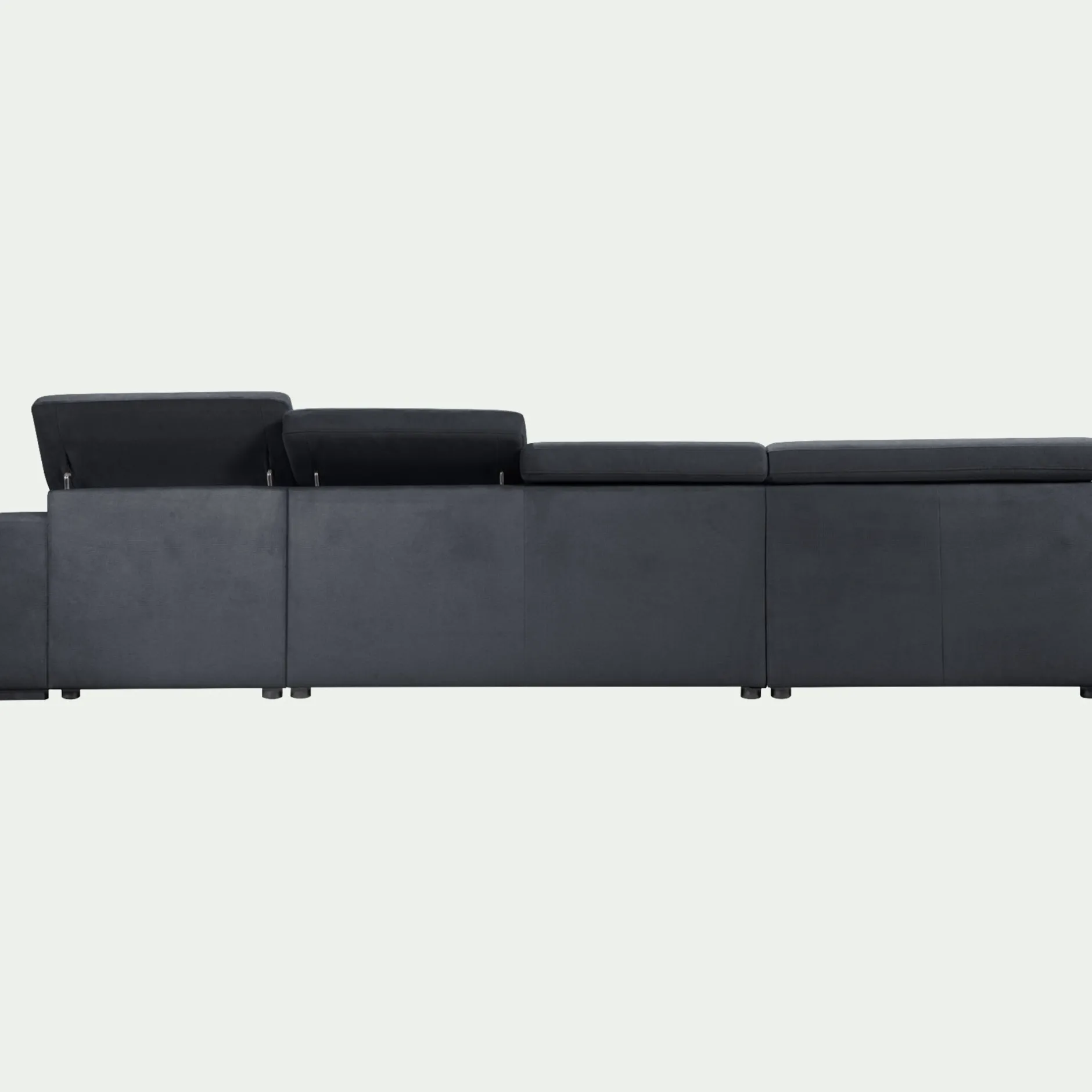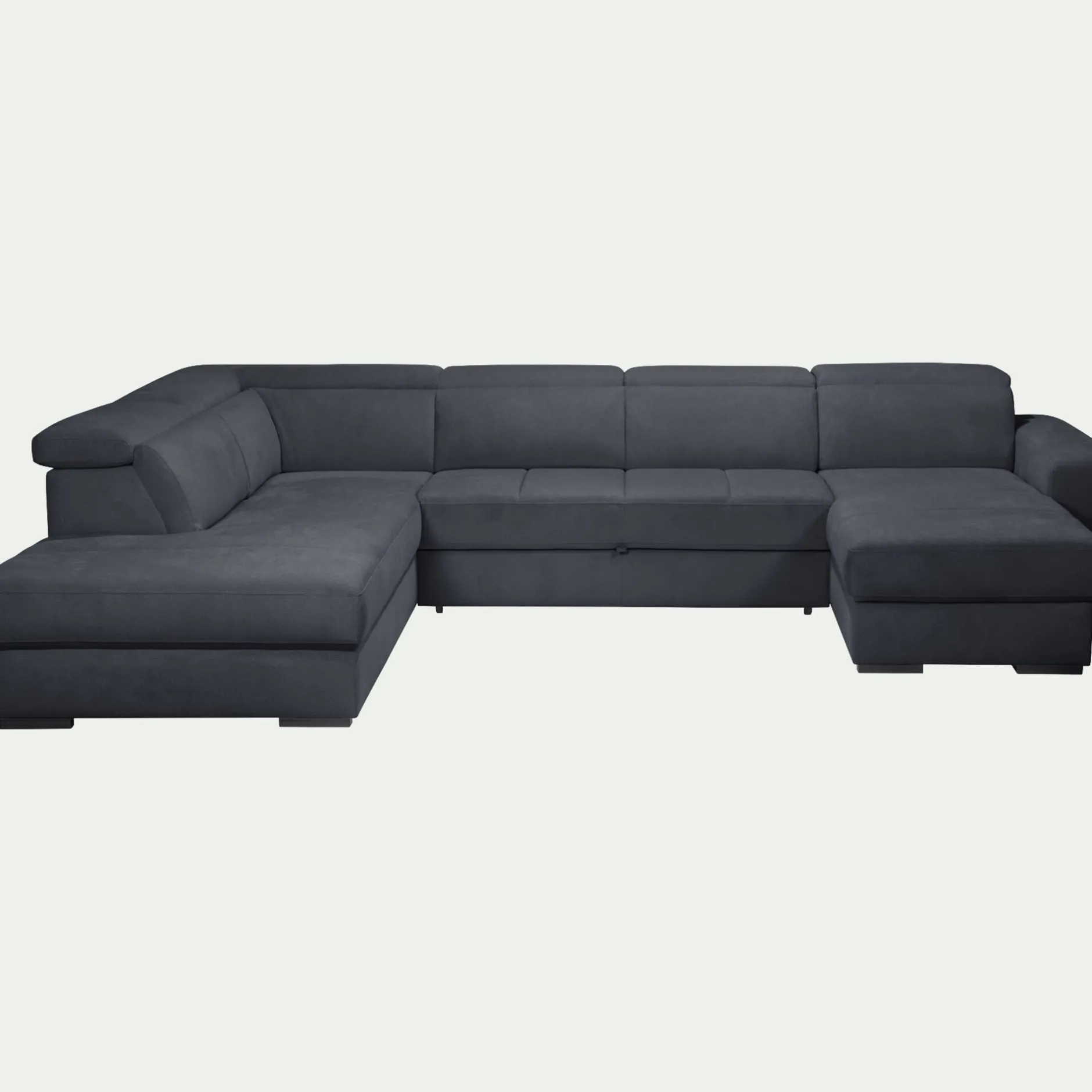 Un superbe canapé en U en tissu d’une couleur bleu calabrun, idéal pour un grand salon. Ce canapé vous offre un espace détente spacieux et confortable avec son assise capitonnée et ses têtières relevables qui accompagneront tous vos mouvements. Convertible, il met à votre disposition un couchage d’appoint de 130×200 cm avec un matelas de 10 cm d’épaisseur qui se déploie aisément. Pratique et astucieux grâce à son coffre et sa méridienne droite, ce grand canapé allie fonctionnalité, style et confort.
