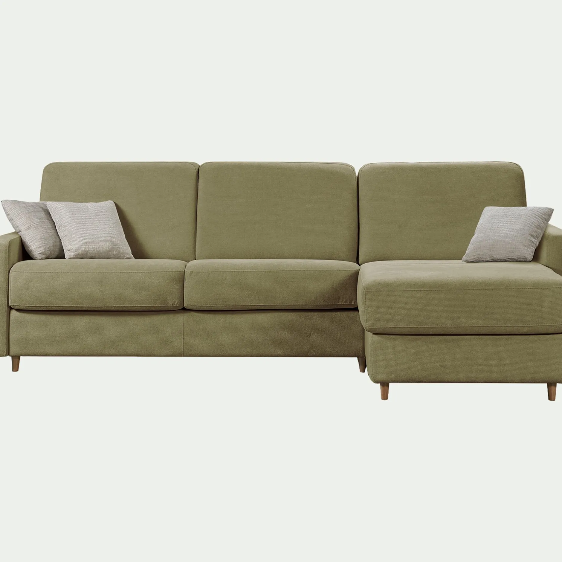 Le canapé Gaya conjugue avec brio élégance italienne et fonctionnalité. Réalisé avec un savoir-faire d’exception, ce canapé d’angle convertible associe design et confort pour s’intégrer harmonieusement dans le salon. Son système ingénieux dévoile en quelques secondes un couchage quotidien de 140×195 cm, doté d’une densité de 35kg/m³ qui assure un soutien optimal et des nuits agréables. Le mécanisme express permet l’ouverture sans retirer les coussins, pour un usage simple et fluide. Revêtu du tissu Sogno dans notre coloris vert cèdre, il apporte une note naturelle et raffinée tout en garantissant une assise confortable et un maintien adapté à chaque partie du corps. Pratique, il intègre un coffre de rangement dans la méridienne et son angle est réversible pour s’adapter à toutes les configurations. Les coussins d’assise et de dossier sont déhoussables, parfaits pour un entretien facile.