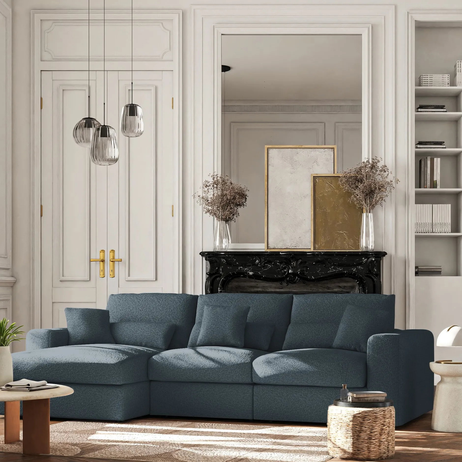 Avec son petit angle à gauche, ce canapé d’angle est une invitation aux moments partagés. Son revêtement en tissu bouclette, à la fois doux et résistant, enveloppe l’espace d’une chaleur réconfortante. Son coloris bleu, intemporel, s’harmonise avec tous les styles d’intérieur. Pensé pour le confort, ce canapé fixe se compose d’une assise spacieuse, d’un dossier accueillant et de coussins déhoussables pour un entretien facilité. Des coussins décoratifs viennent parfaire l’ensemble, ajoutant une touche cosy. Un canapé idéal pour des instants de détente en famille ou entre amis.