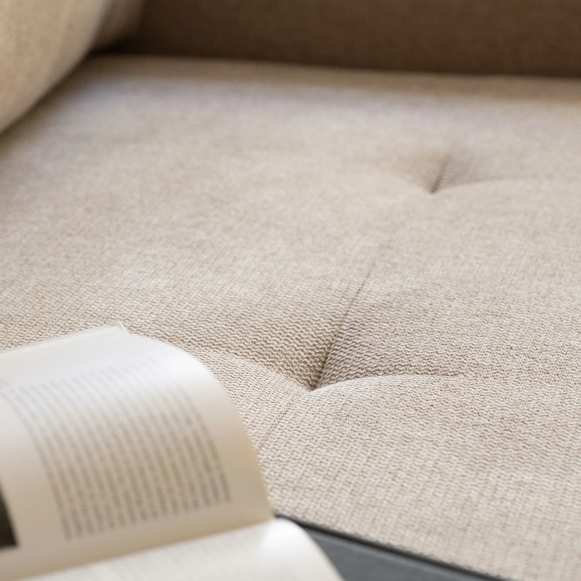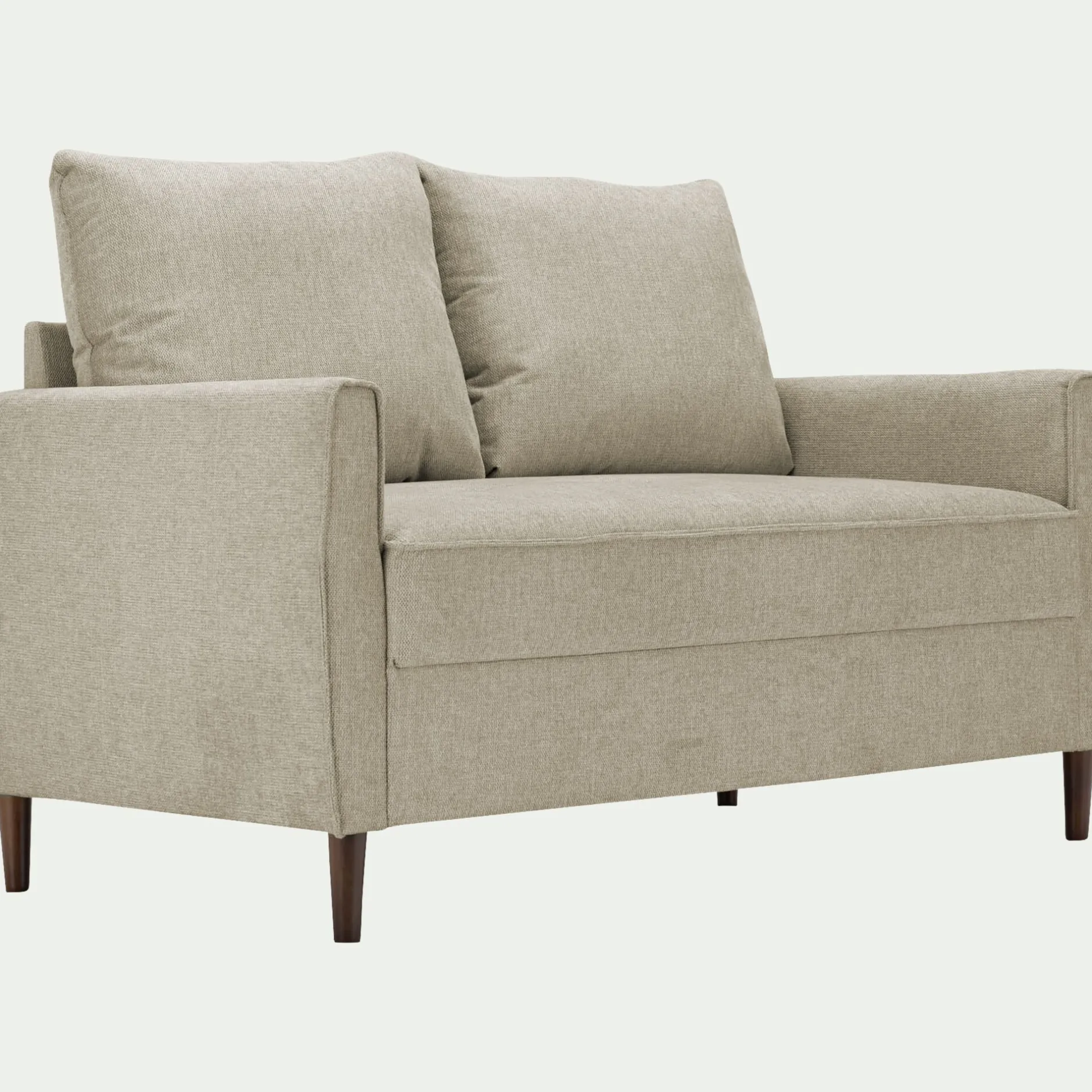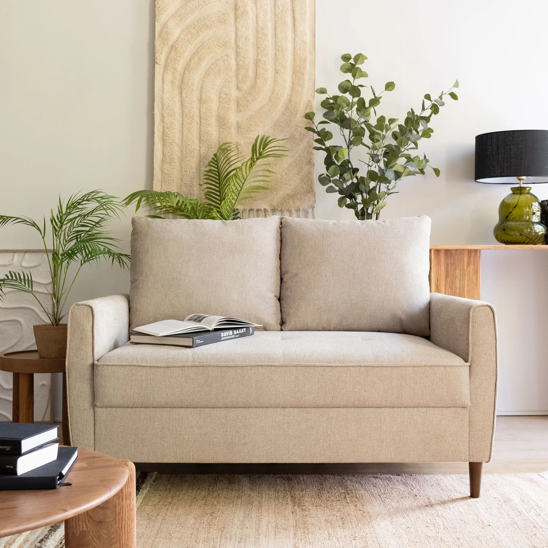 Pensé pour s’adapter à chaque intérieur, ce canapé 2 places permet de vous détendre sans prendre une grande place dans la pièce, il se place selon les envies et l’agencement de votre intérieur. Sa structure en bois accueille une assise en mousse généreuse, complétée par trois coussins de dos qui offrent un soutien optimal aux lombaires et aux épaules. Son revêtement en tissu beige, à la fois profond et naturel, habille ce canapé d’une élégance intemporelle. Il repose sur des pieds en bois de hêtre qui renforcent son allure chaleureuse et naturelle. Compact avec ces 132 cm de long, ce canapé 2 places fabriqué en Roumanie est idéal pour conjuguer style et confort au quotidien, même dans un petit salon.