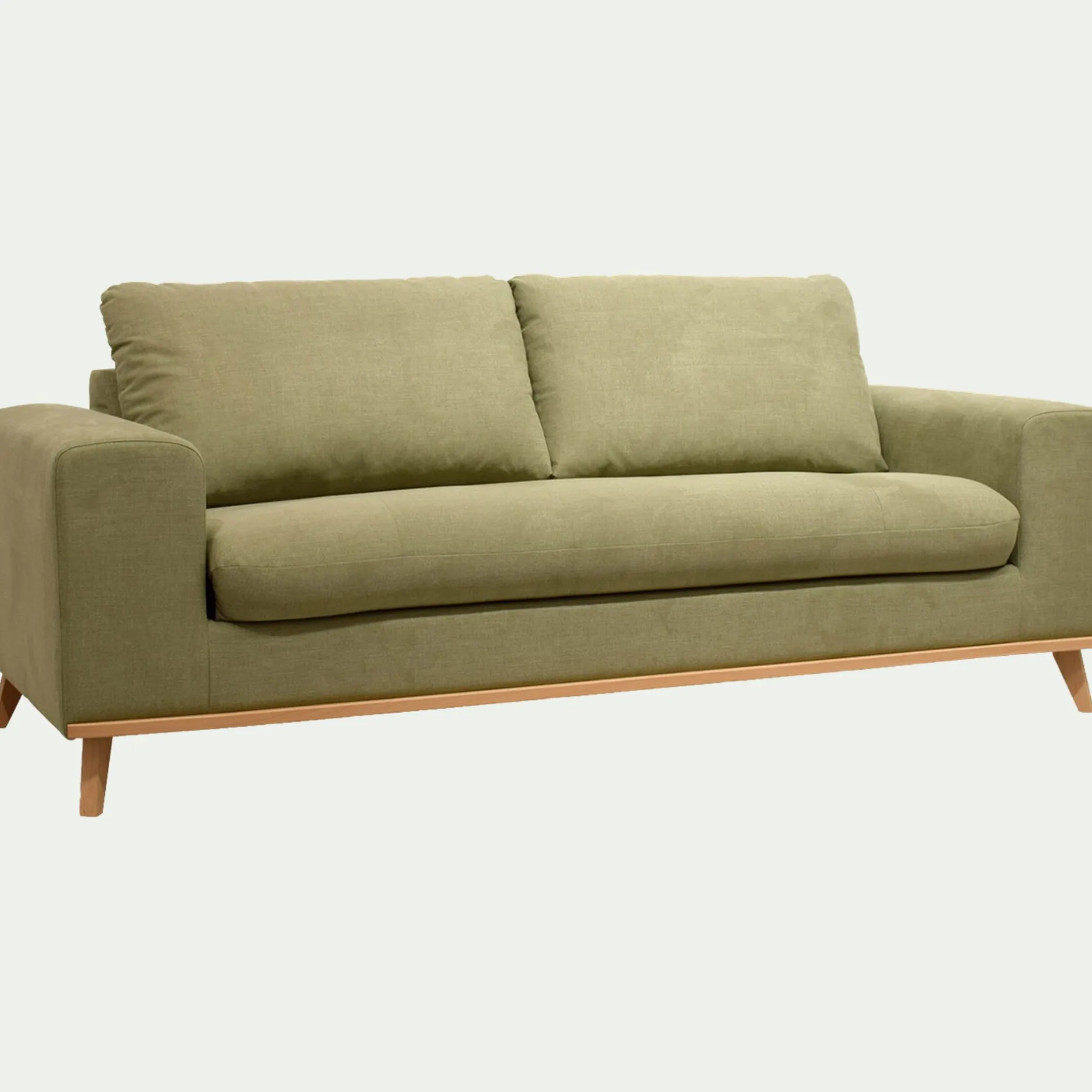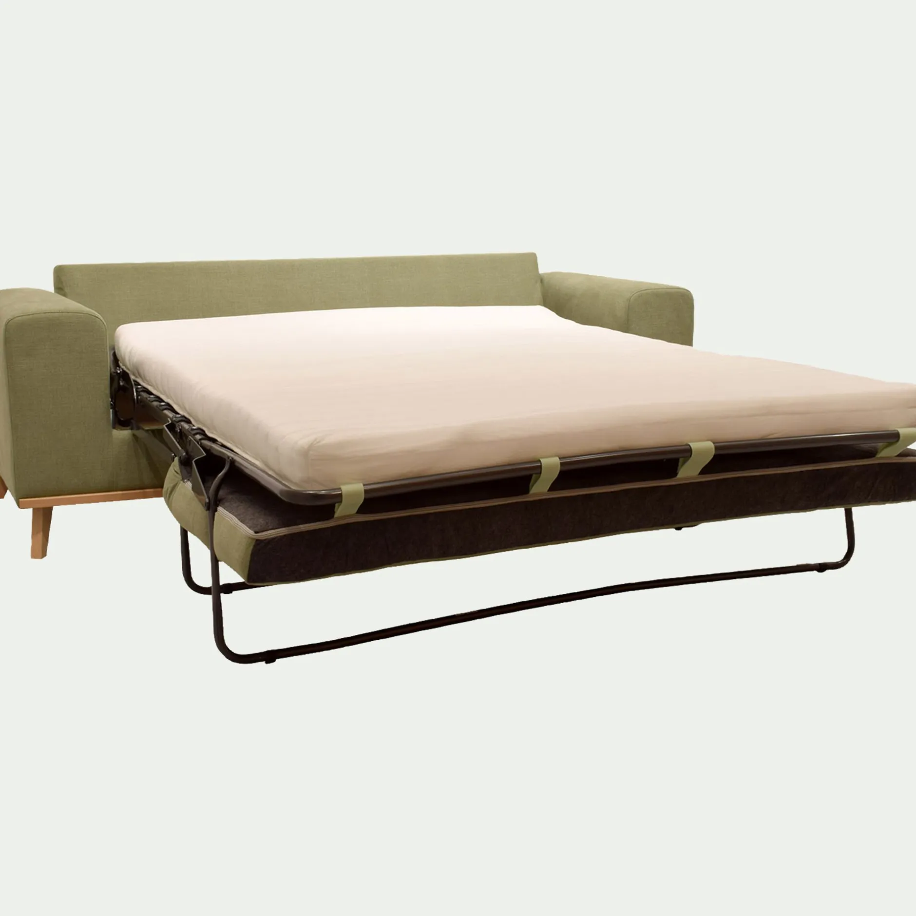 Le canapé 3 places convertible Capia allie confort, style et praticité. Ce canapé est revêtu du tissu Cosmo dans notre coloris vert kaki, tendance et naturel. De jour, ce canapé droit offre une assise spacieuse pour 3 personnes. Le soir venu, il se déplie en quelques secondes grâce à son système express et révèle un couchage de 140×188 cm. Son matelas intégré de 10 cm d’épaisseur est parfait pour un usage occasionnel, par exemple pour recevoir famille ou amis pour la nuit. Son tissage résistant apporte douceur et durabilité, parfait pour une utilisation quotidienne. Son design repose sur une structure en pin massif et des pieds en hêtre massif, gage de solidité et de durabilité. Les coussins de dos déhoussables facilitent l’entretien. Une fabrication française qui conjugue esthétique et fonctionnalité.