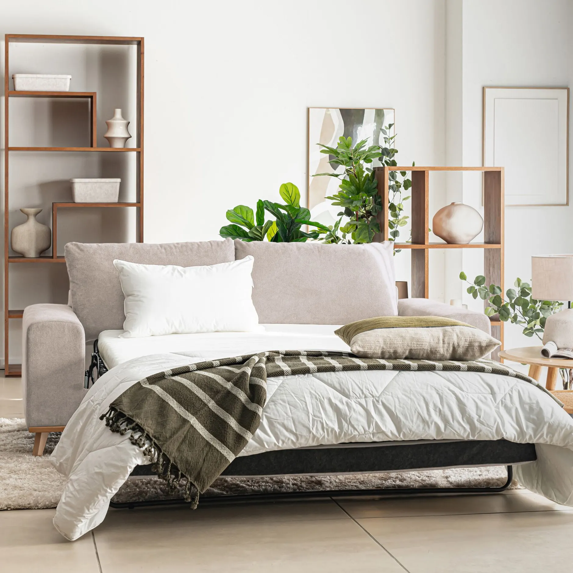 Le canapé convertible Capia allie confort, style et praticité. De jour, il offre une assise spacieuse pour 3 personnes. Ce canapé est alors revêtu d’un tissu crown beige roucas, profond et élégant. Son tissage apporte douceur et résistance, parfait pour une utilisation quotidienne. Le soir, il se transforme en un couchage d’appoint de 120×190 cm grâce à un mécanisme d’ouverture rapide et facile, intégrant un sommier et un matelas pour un confort optimal. Son design repose sur une structure en pin massif et des pieds en hêtre massif, gage de solidité et de durabilité. Les coussins de dos déhoussables facilitent l’entretien. Une fabrication française qui conjugue esthétique et fonctionnalité.