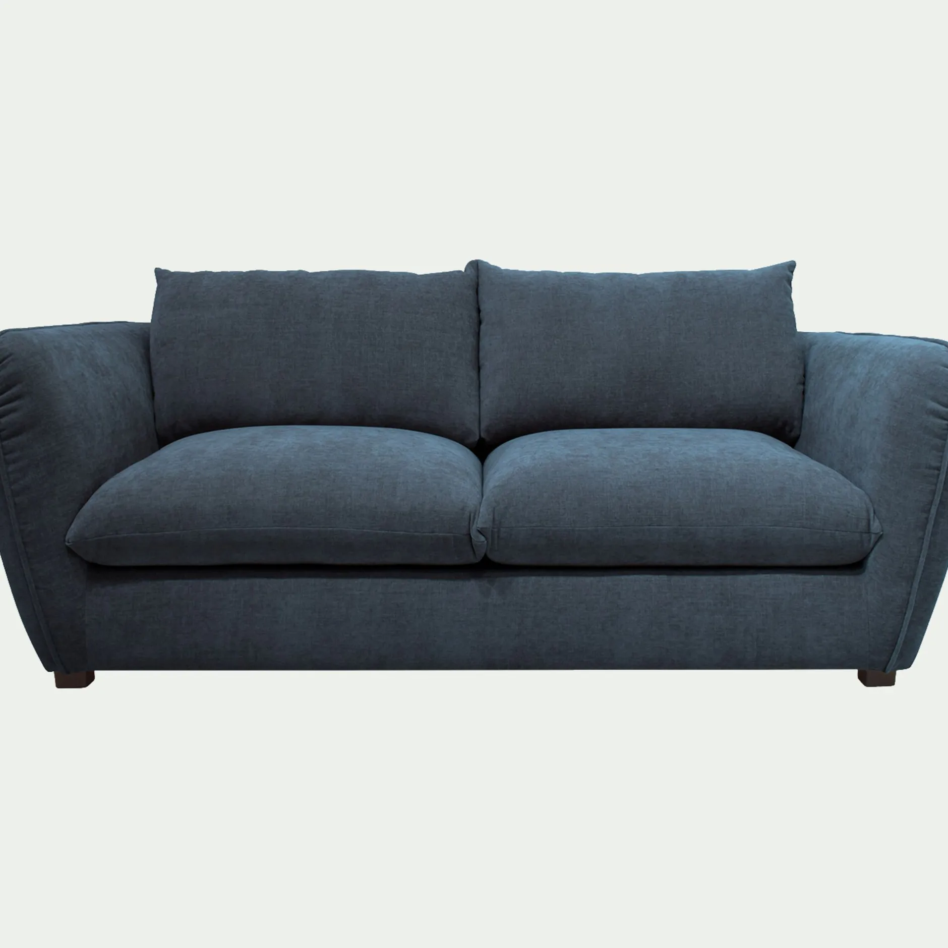 Alliant style et confort, ce canapé droit 3 places séduit par ses formes généreuses et son assise profonde, promesse de détente absolue. Revêtu d’un tissu bleu, il impose une présence joyeuse tout en s’intégrant avec élégance dans la décoration. Son design cossu, sublimé par des coussins moelleux et déhoussables, conjugue esthétique et praticité pour un entretien facilité. Fabriqué en France, ce canapé fixe repose sur une structure en bois massif, gage de solidité et de longévité. Pensé pour offrir un confort optimal, il invite à de longs moments de relaxation, que ce soit pour une pause lecture ou des instants conviviaux. Une pièce de caractère, où chaque détail évoque l’élégance et la détente.