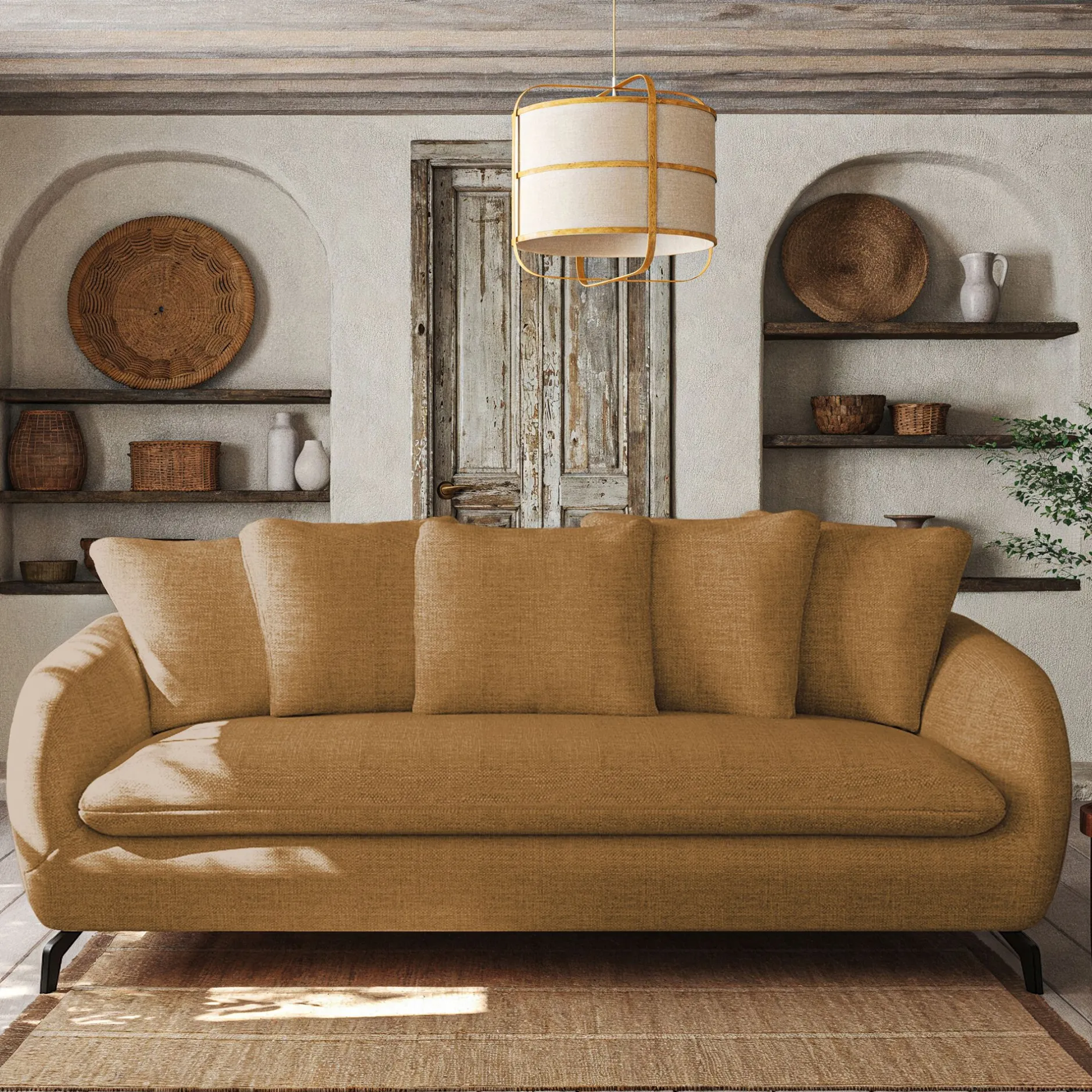 Un joli canapé 3 places fixe en tissu pour profiter agréablement de votre salon. Un look contemporain et accueillant, sublimé par un piétement original en acier noir. Vous apprécierez la forme du dossier et des accoudoirs qui vous offrent un maintien optimal de votre dos pour un confort d’assise exceptionnel. Un canapé fabriqué en France, dans des ateliers proches de la ville de Bourge, qui incarne l’excellence du savoir-faire français. Un coloris bronze qui apporte une note lumineuse et chaleureuse à votre décoration de salon.