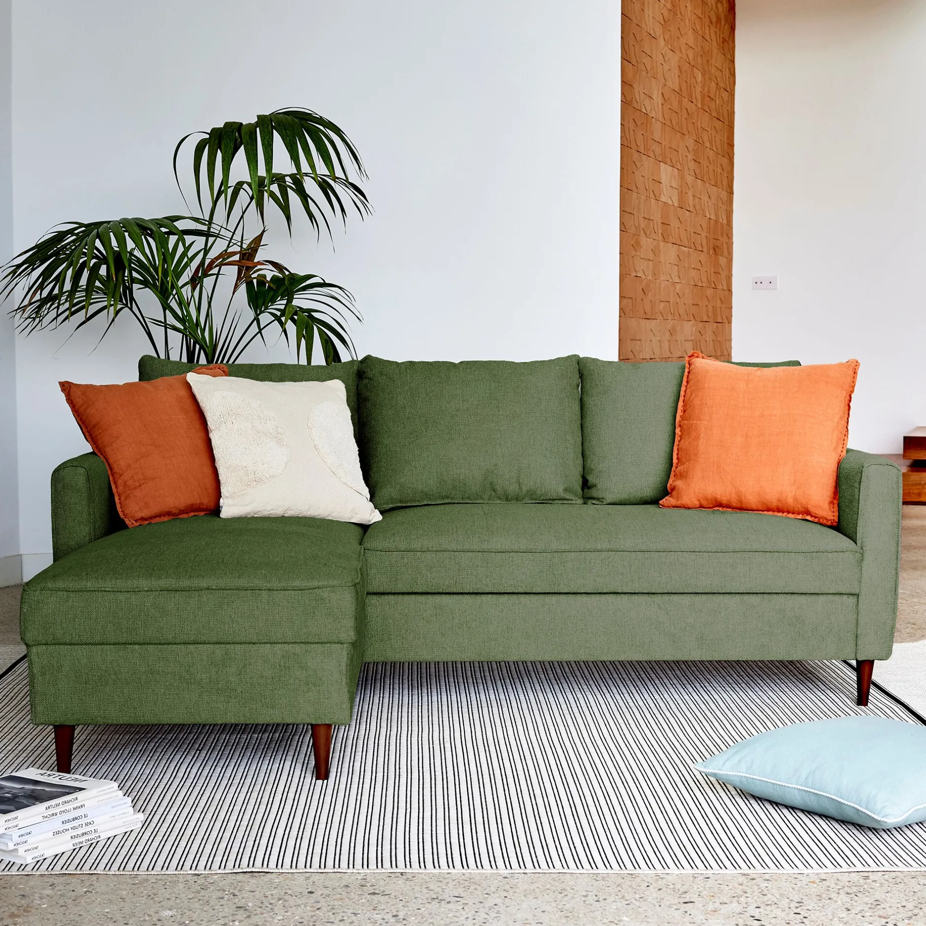 Pensé pour s’adapter à chaque intérieur, ce canapé d’angle réversible permet de choisir l’orientation de son angle, à gauche ou à droite, selon les envies et l’agencement de la pièce. Sa structure en bois accueille une assise en mousse généreuse, complétée par trois coussins de dos qui offrent un soutien optimal aux lombaires et aux épaules. Son revêtement en tissu tramé vert, à la fois profond et naturel, habille ce canapé d’une élégance intemporelle. Non déhoussable, il repose sur des pieds en bois de hêtre qui renforcent son allure chaleureuse et naturelle. Compact avec ces 192 cm de long, ce canapé d’angle 3 places fabriqué en Roumanie est idéal pour conjuguer style et confort au quotidien, même dans un petit salon.