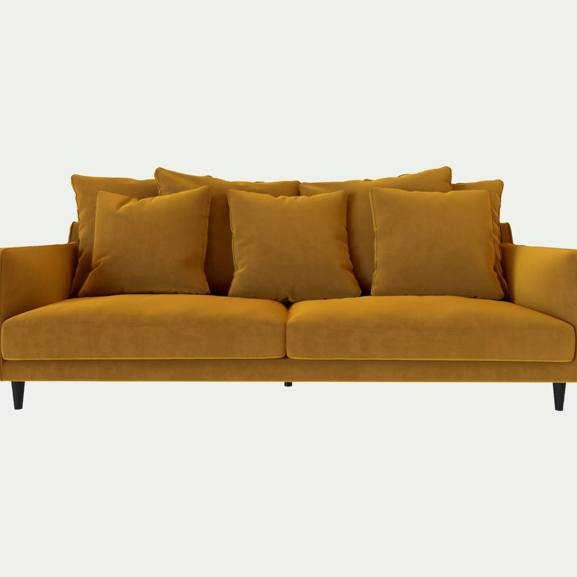 Ce canapé droit 4 places incarne l’élégance italienne dans une version chaleureuse et lumineuse. Revêtu du tissu velvet, au toucher charnu et à l’apparence de velours, il séduit par sa texture délicate et sa douceur exceptionnelle. Son coloris jaune argan illumine la pièce et insuffle une énergie solaire au décor. Fabriqué à la main en Italie, il témoigne d’un savoir-faire artisanal raffiné. L’assise, généreusement garnie de plumes d’oie, offre un confort moelleux et enveloppant. Monté sur des pieds en hêtre massif, ce modèle entièrement déhoussable marie esthétique et praticité avec brio. Une pièce forte et rayonnante pour sublimer le salon.