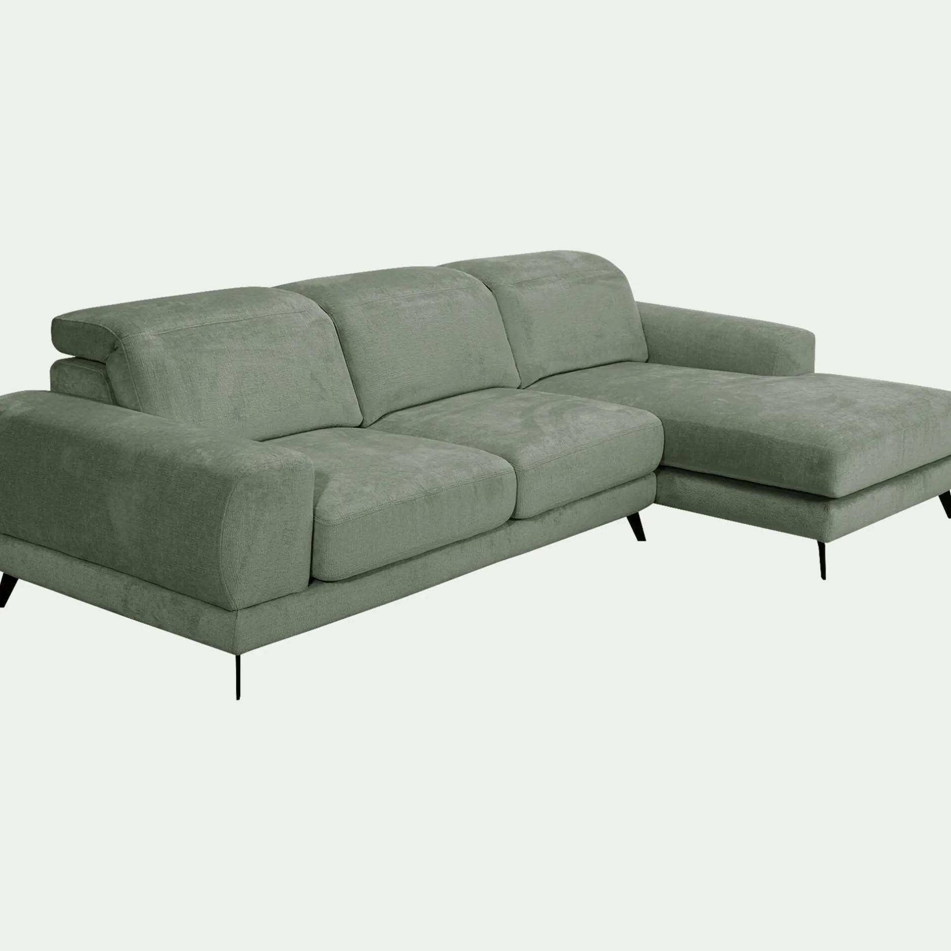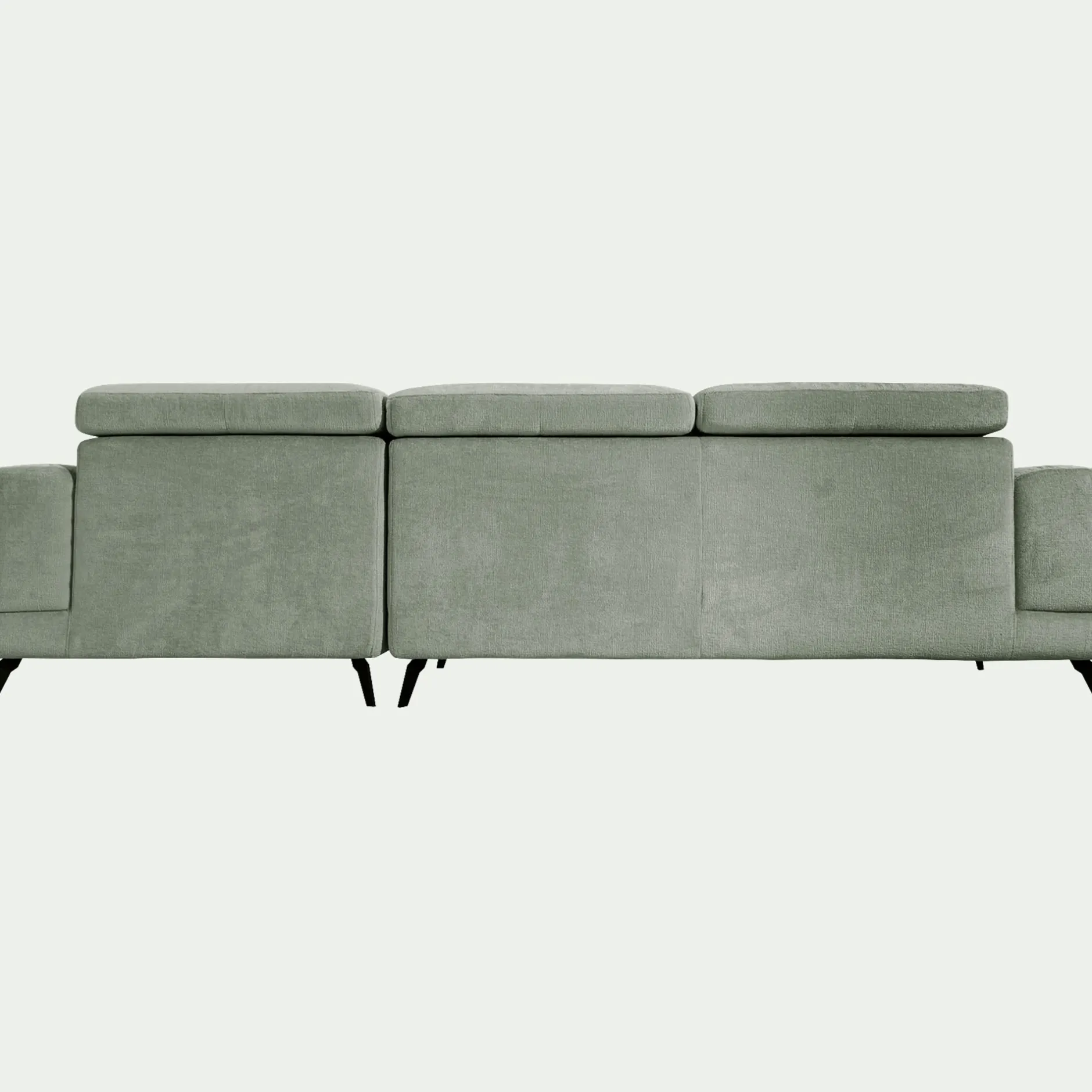 Choisissez un canapé d’angle droit à la fois design et pratique pour votre maison. Le canapé Palermo, avec son look épuré qui rappelle les modèles italiens, est très esthétique, mais il n’en reste pas moins un canapé fonctionnel. Ses têtières réglables et sa fonction avance-recule pour agrandir l’assise, vous permettent de moduler l’assise et le confort. Vous disposerez d’un canapé avec une assise plus droite pour des moments conviviaux autour d’un apéritif ou encore de moments de détente grâce à une assise plus allongée. Fabriqué en Europe, il garantit une durabilité et une résistance exceptionnelle. En tissu doux vert cèdre, il s’adapte à tous les intérieurs pour une atmosphère sophistiquée et élégante.